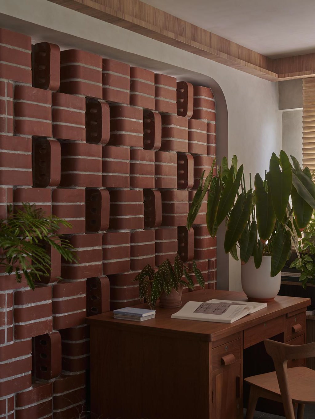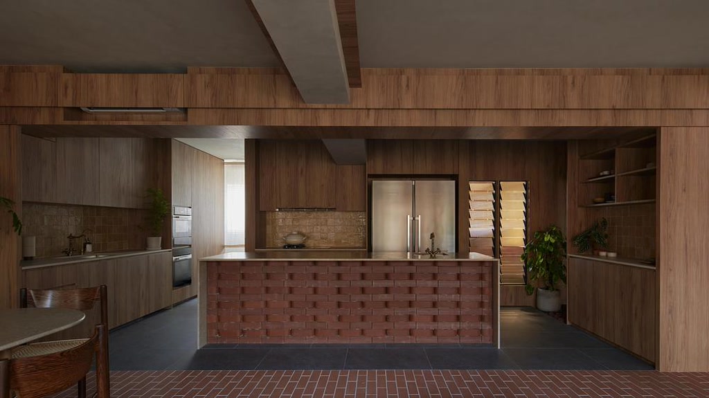 The rounded profile of the brick introduces a softness that contrasts with the typical rigidity of domestic interiors. It allows surfaces to curve, edges to ease, and boundaries to loosen. A freestanding brick wall subtly divides the study from the living area, not as a barrier, but as a porous threshold. Between the study and dining spaces, a curved bench emerges — shared, accessible from both sides, and open to occupation. These gestures resist compartmentalisation, encouraging movement, overlap, and informal use.