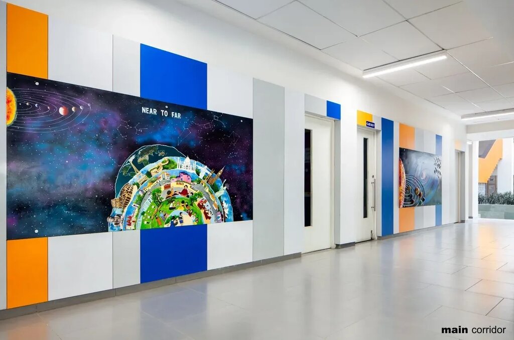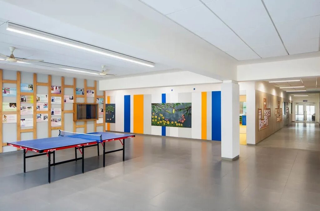 The interior design scheme is based on the idea of bringing a youthful and spirited ambience into each space. The corridors form a unifying element throughout the school and are transformed into spaces where students can express themselves through drawings, display boards and artworks. Care is taken to ensure that chalkboards and display boards are at an accessible height for children, making it an inclusive and engaging environment.