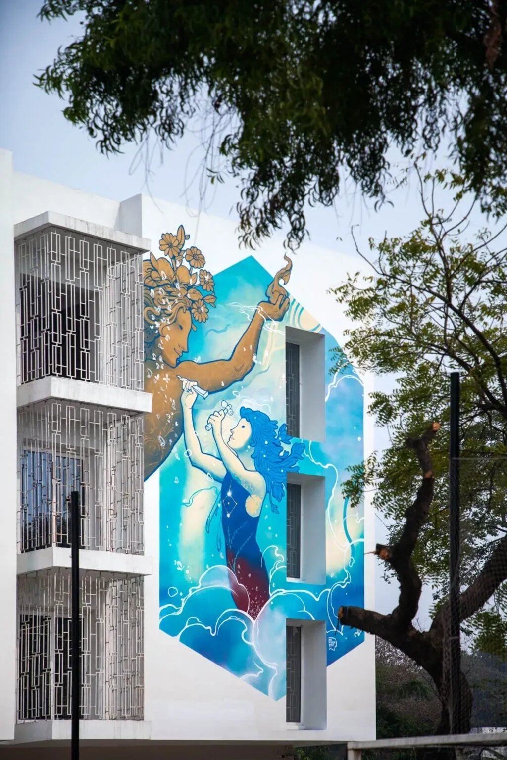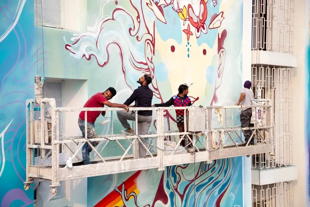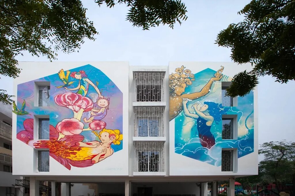 In a unique celebration of the convergence of architecture, art and value-based learning, the building itself acts as a third teacher conveying the values of the school: perfection, harmony, wisdom and strength. Through a collaborative process between artist Harshvardhan Kadam of ST+ART and the students and teachers of the school, four striking, large-scale illustrations of the values animate the blank walls, creating an intriguing and welcoming gesture for the school.