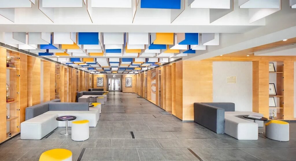 The refurbishment also entailed the revamp of the interiors of the administrative block to create a playful, yet sophisticated ambience to encapsulate the ideology of the school. One of the ways this has been done is with the introduction of colourful and dynamic suspended false ceiling elements in a combination of white, blue and orange. The vibrant ceiling is paired with monotones used in the carpeted flooring and furniture. The walls are panelled with wood veneer with intermittent fabric panelling used as displays for trophies and boards highlighting students’ achievements.