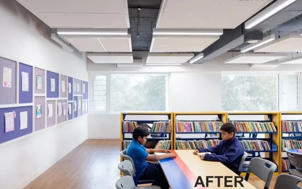 The library and research lab were also redesigned with furniture and storage units ergonomically designed specifically for children. Classrooms also feature low-level storage units, chalkboards and fabric pin-ups where students can express themselves. Storage is kept to a minimum in order to create free-flowing spaces for students to move around.