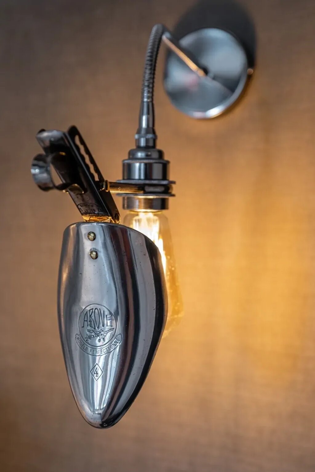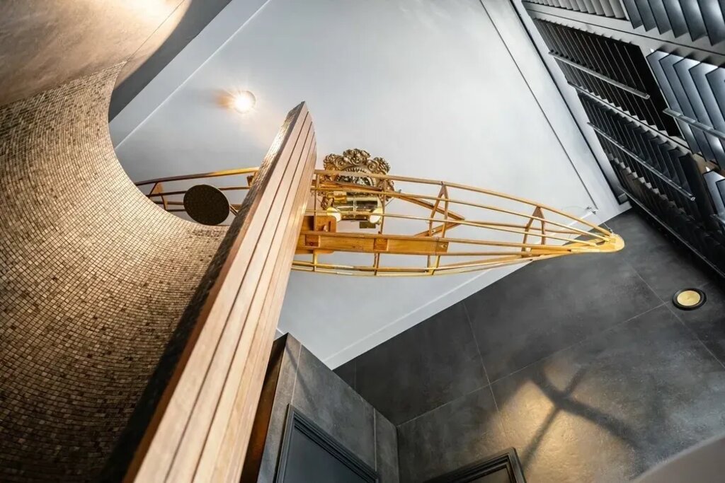 Amongst the unique elements are an old canoe serving as a ceiling lamp, a wardrobe made with the emergency exit door of a Fokker F28 jet airliner, and reclaimed aluminum shoe-stretchers from the 1940’s getting a second chance in life as wall mounted reading lights. Every corner, nook, and cranny offers another design surprise.