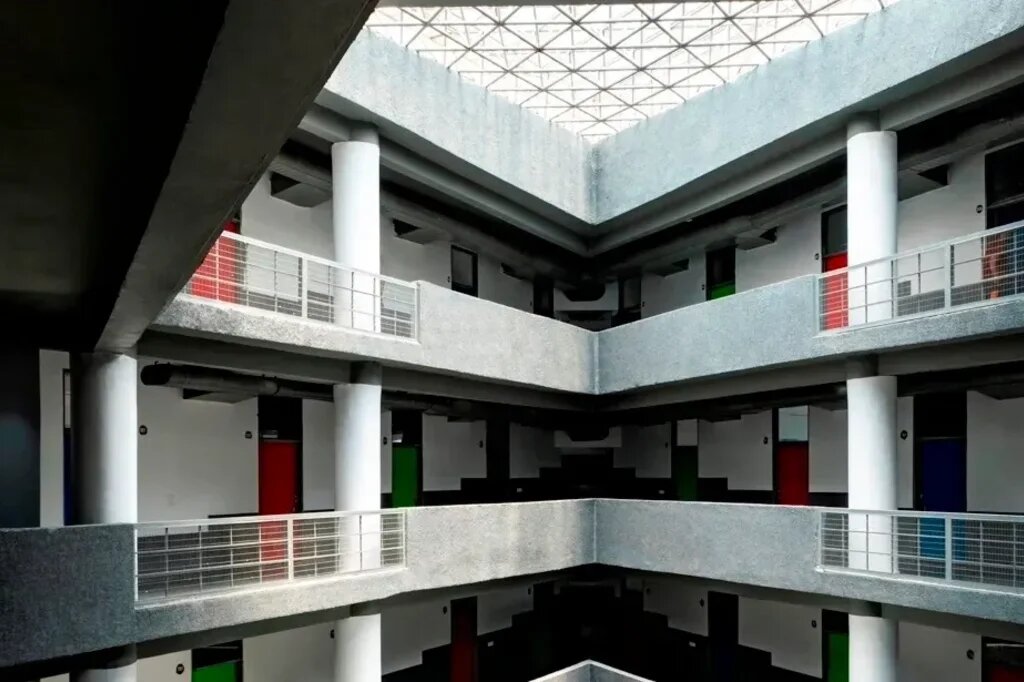 The structure also possesses a sculptural quality reminiscent of Corbusier’s brutalist vocabulary. Dappled daylight streaming through the skylights plays a pivotal role in shaping the sensory experience of the hostel, giving it a distinctly spiritual identity. Designed with a focus on both experience and budget constraints, the CGC Student Hostel exemplifies frugality while enhancing the quality of students’ living spaces.