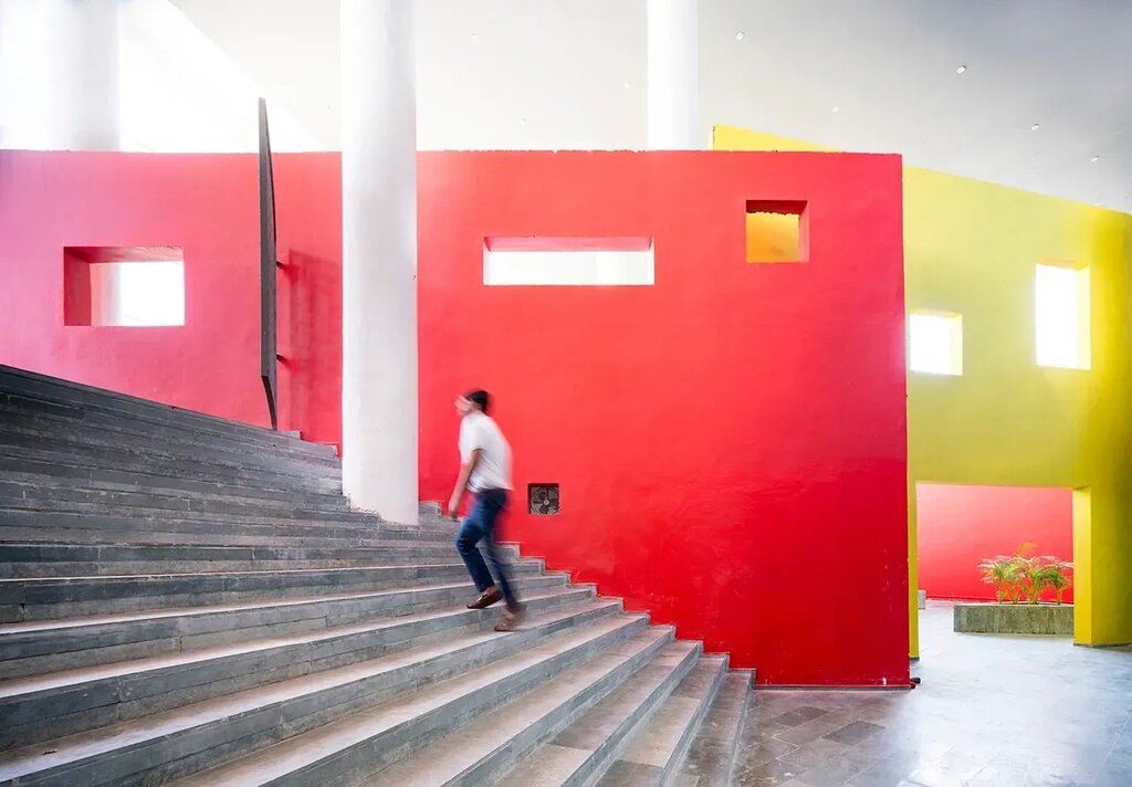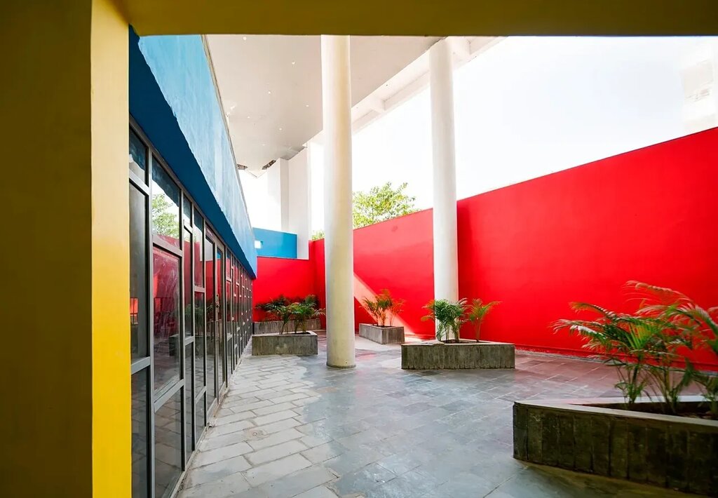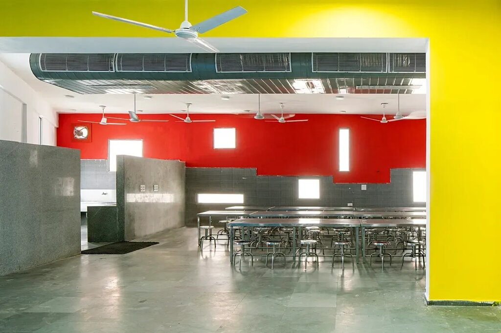 While the floor plans are straightforward, the interconnected levels and well-lit interior spaces imbue the resulting volumes with a dynamic character. Le Corbusier’s architectural influence is evident in the overall minimalist material palette and color choices of the hostel building: Kota stone flooring, grey grit exteriors, and plain white surfaces accented with primary colors are meant to evoke a sense of discovery and joy.