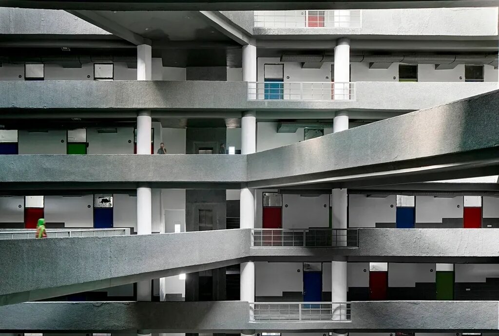Designed by Charged Voids the student hostel for the Chandigarh Group of Colleges, situated within a twenty-five-acre campus in Landran, a semi-urban area near Mohali, Punjab, draws inspiration from Chandigarh city’s modernist legacy. This 10-storey building occupies the campus’ bus yard instead of the initially proposed greenfield site. A simple triangular plan maximizes the use of the oddly shaped site while creating multiple interactive volumes by playing with different levels.