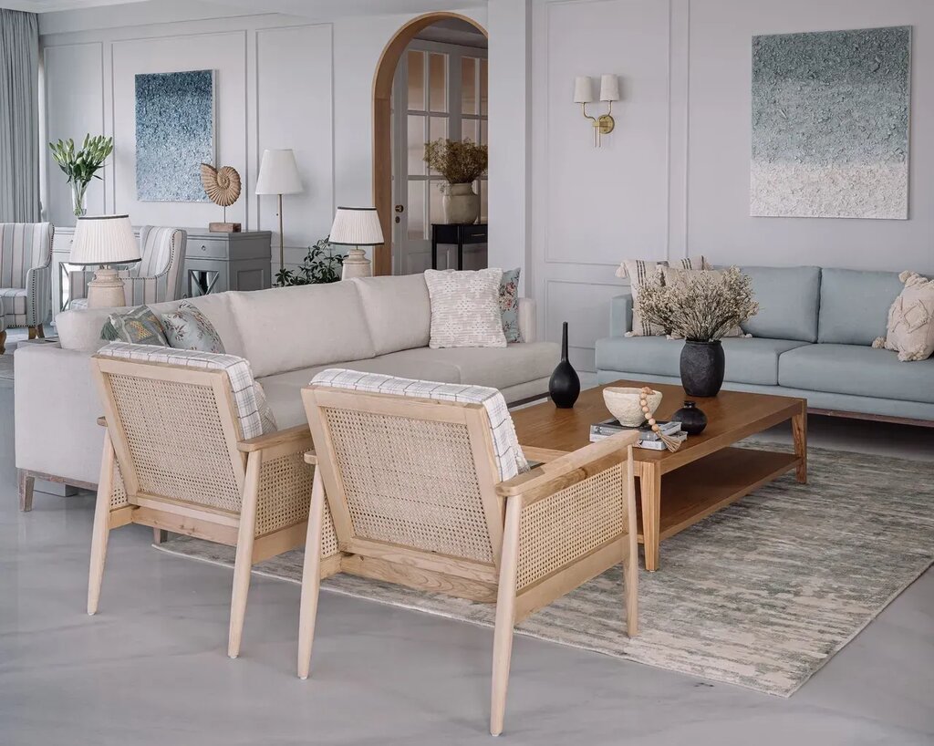 The tranquil living room is an expansive space demarcated by statement furniture pieces, each of which reflects the overriding design aesthetic. The pristine white Bianco Esilla flooring from Classic Marble Company ties the space together, which is beautifully contrasted by the grey walls. Segregating the space with the formal area, is a curated pair of sofas in mellow shades and a pair of classic Chandigarh chairs in a light oak wood finish.