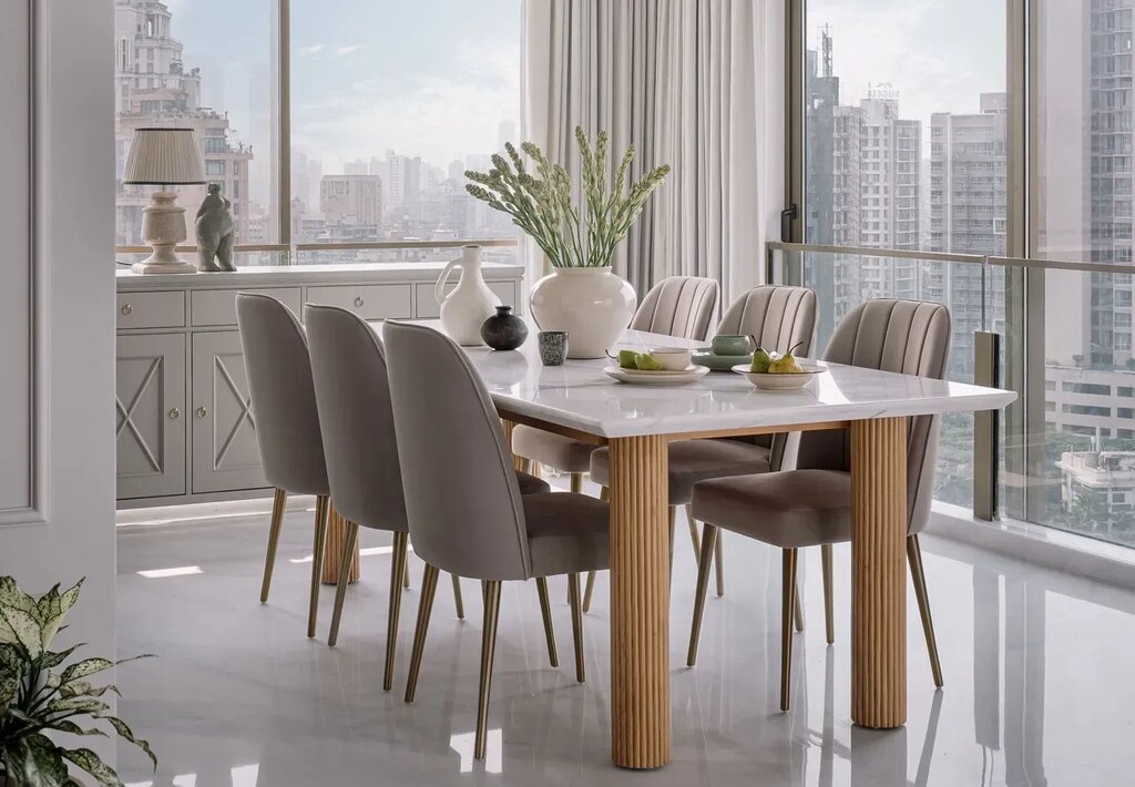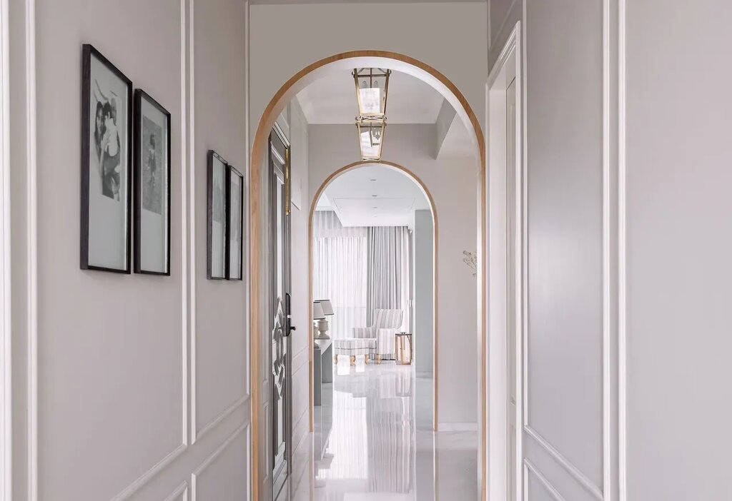 Located between windows on two of its sides, the dining table is connected to the living through a pseudo-three-centred arch, which adds to the neoclassical appeal. A minimalistic table top in white marble sits on fluted oak wood legs, paired with grey dining chairs. Keeping functionality in mind, the area is connected to the kitchen through a sliding partition door with fluted glass. Channelling opulence into the setting are two chandeliers on the top. However, it is the views of the skyline that is the show stopper here. Arches become a motif for the home, lining the central corridor. A pair of consecutive arches become guiding elements, leading one from the living spaces to the bedrooms. The paneled passage is lined with black and white art frames on one side, breaking the symmetric with poetic elegance.