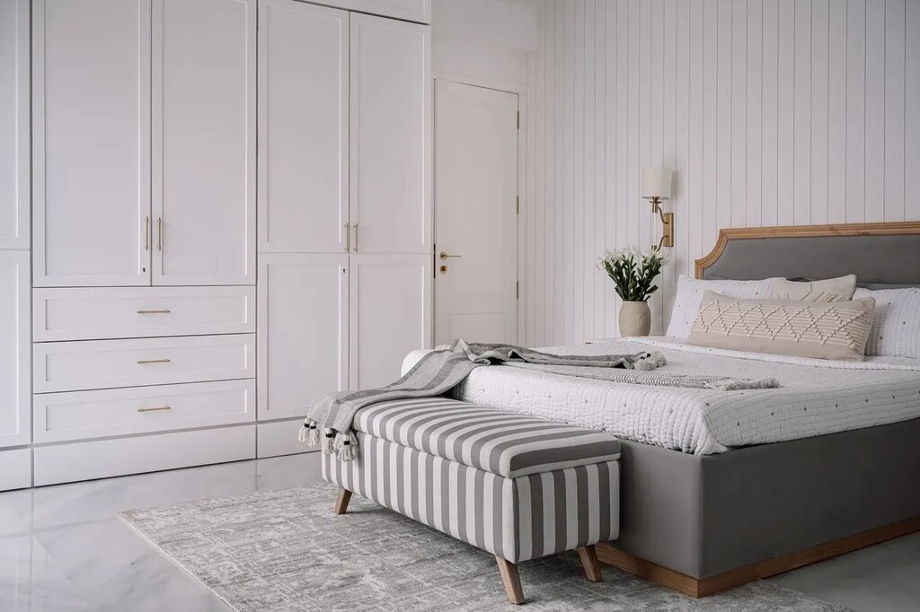 The master bedroom is sublime, with an all-white decor framing the grey-toned furniture pieces. Layering the space with textures and materials, the designers add depth and character to the single-hued space. Here, a play of lines becomes evident, witnessed in the paneled wall, the proportion of the wardrobe and the print of the ottoman. Like the room, the bathroom reflects the white aesthetic through the white marble-clad on all the surfaces, along with the cast-in-situ basin counter on a wooden cabinet. It is further made luxurious through hints of gold incorporated through the accessories.