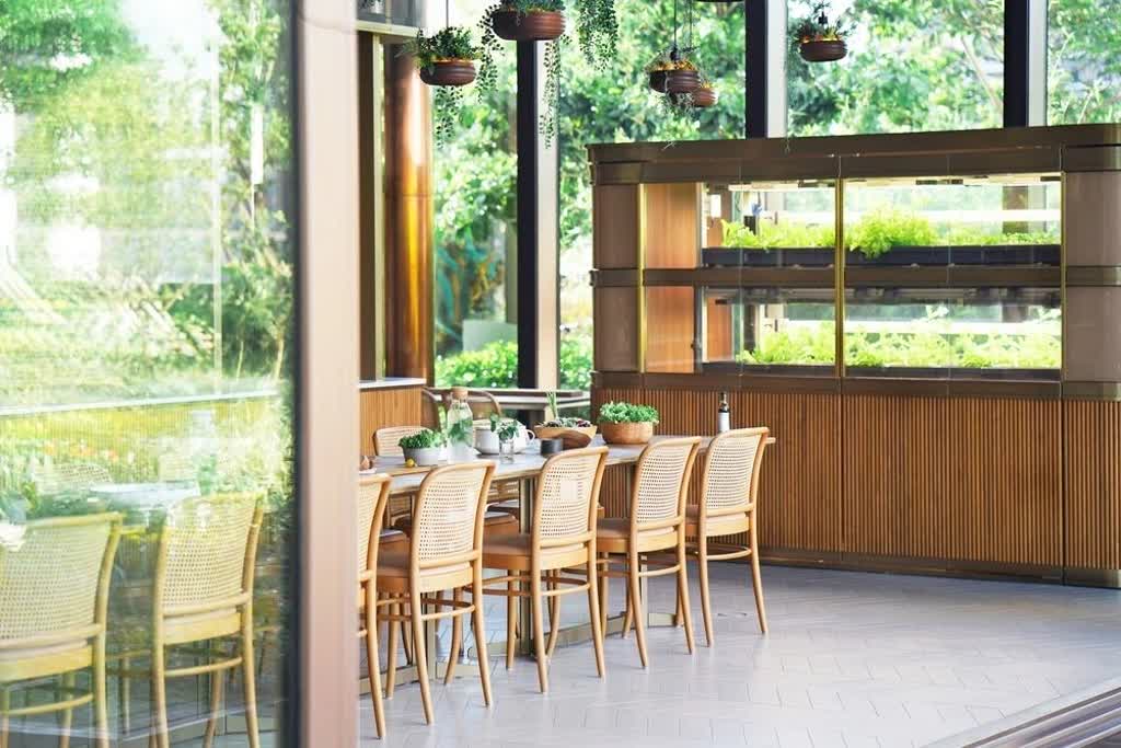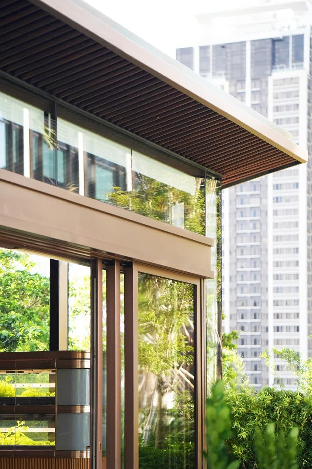 The steel structure, aluminium cladding, and glasses were all prefabricated and installed on-site to reduce construction waste. The roof is slightly pitched forward so that the architecture catches the prevailing wind from the harbour while visually embracing the farm. The reflection of the farm on the glasshouse against the surrounding skyscrapers produces a visual reminder of the co-existence of nature and urbanism. The door handles, pendant lamps, and dining tables were crafted by LAAB using sustainable wood.