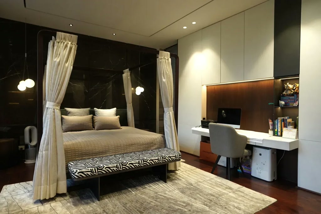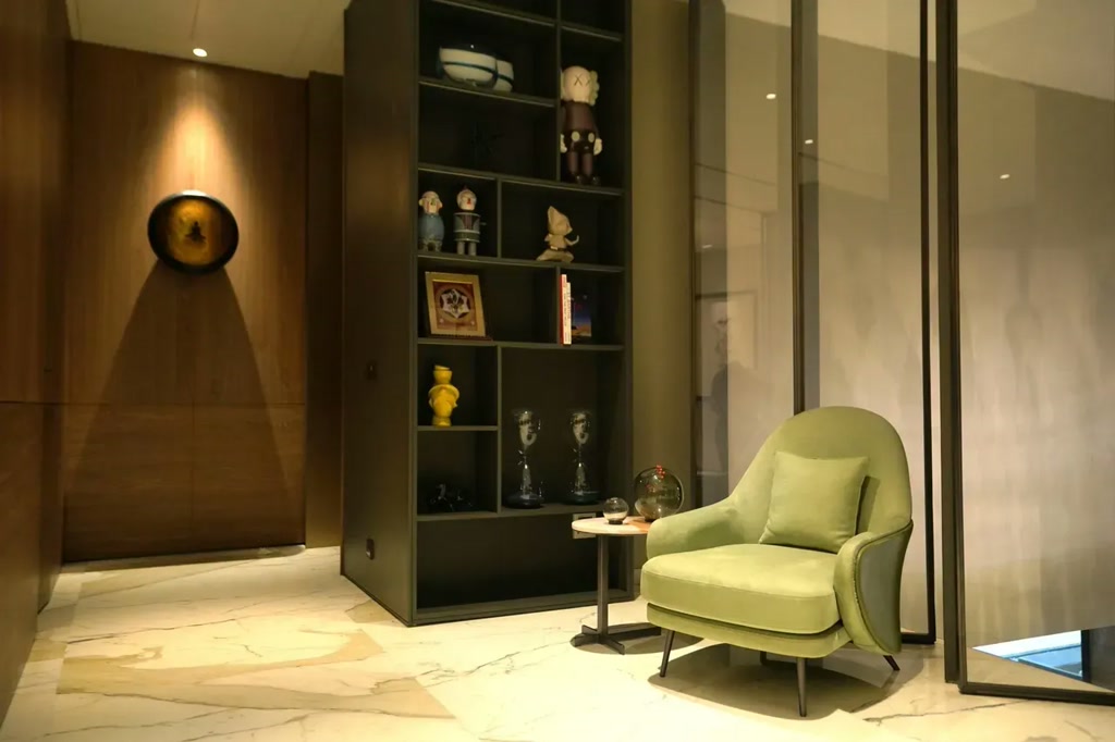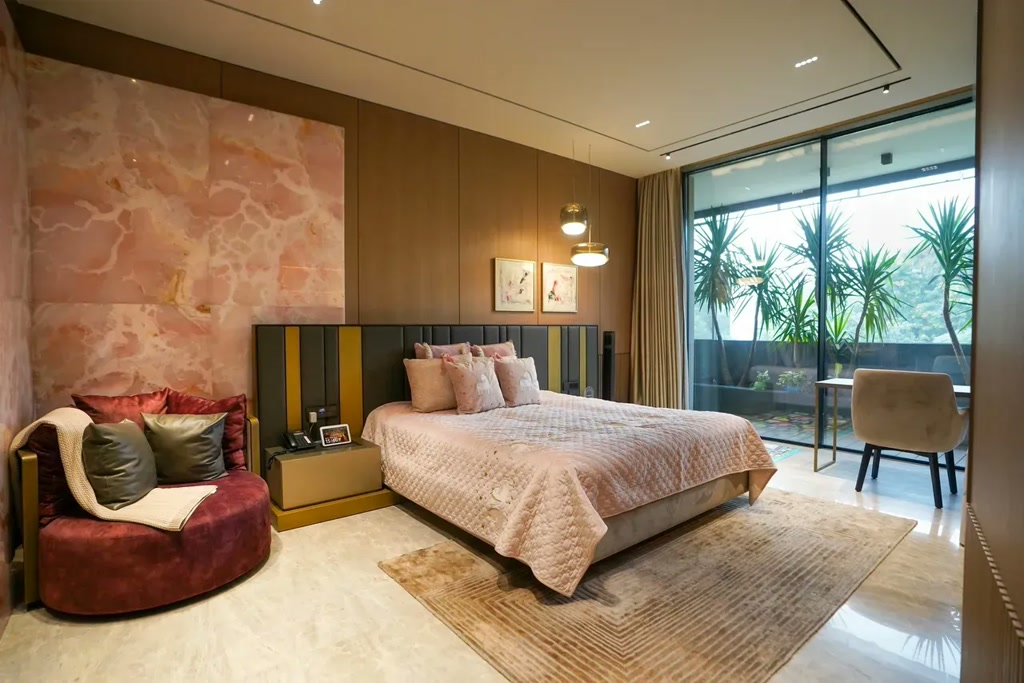 Luxury reveals itself subtly, beginning in the double-height living space. Here, a refined palette of marble, engineered wood, and large-format surfaces creates a sense of openness and quiet grandeur. Floor-to-ceiling glazing draws greenery indoors, allowing light and landscape to shape the ambience throughout the day. The vertical volume encourages interaction while maintaining visual calm, punctuated by carefully placed art that adds warmth and character. Small green pockets – referencing both contemporary international homes and traditional Indian courtyards – introduce a sense of intimacy within the openness.