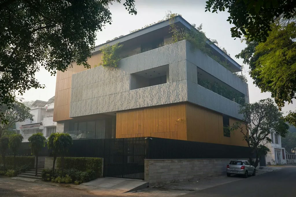 Spanning 16,500 sq. ft., the home announces its presence through a bold yet measured architectural expression. The cubic volume is articulated with horizontal bands that lend the structure a grounded, expansive quality. A layered double-skin façade – composed of wood-finish aluminium louvers and perforated aluminium screens – adds depth while serving multiple purposes: privacy, shading, and thermal efficiency. With controlled openings and concealed glazing, the exterior maintains discretion while revealing a sculptural, restrained elegance. Orientation and daylight play a pivotal role, with large windows and subtle zoning ensuring ample ventilation and light without compromising privacy.
