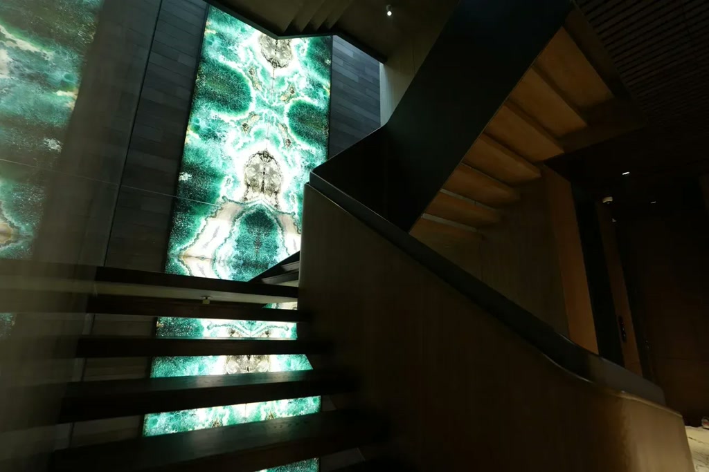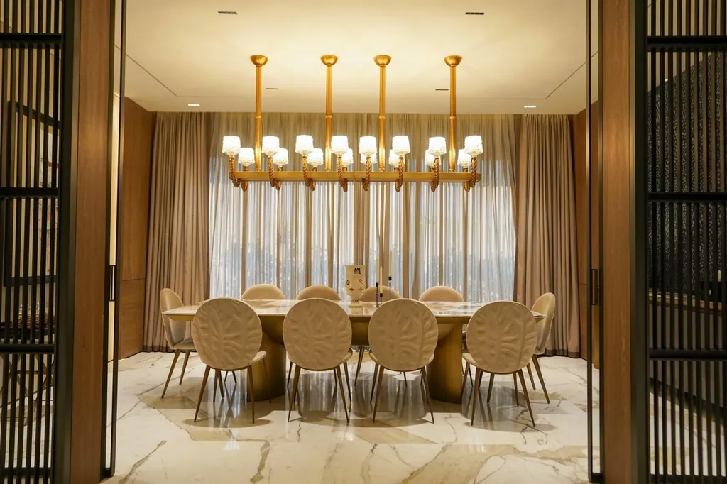 The transition spaces are treated with equal care. A sculptural staircase becomes a focal point, artfully zoned with partition walls and accentuated by backlit stone surfaces that introduce a moment of visual drama without overwhelming the space. Adjacent dining areas are defined through warm statement lighting, fine metal accents, and custom joinery, elevating everyday rituals through detail rather than ornamentation.