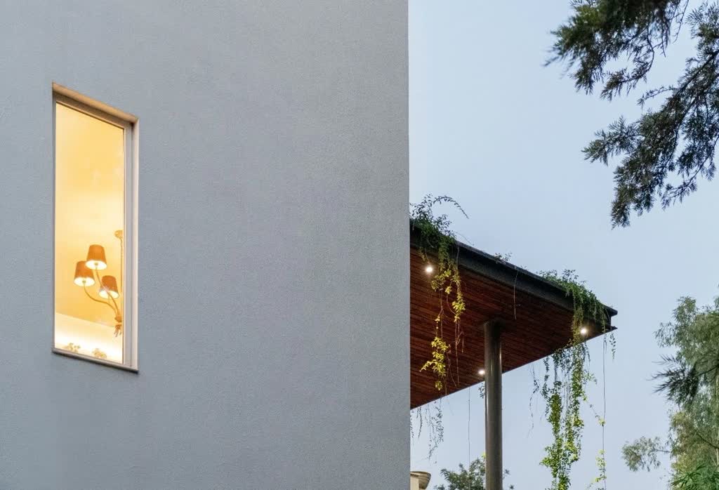 The entrance, paved with concrete, leads one to the entertainment area in the basement that can be accessed by an external staircase, where the formal area of the house is located. As one proceeds, further along, a few steps transition uninhibitedly into an entrance foyer, into a double-height space that is finished with steel and wood, scaling the height of the structure and giving it a sense of freshness.