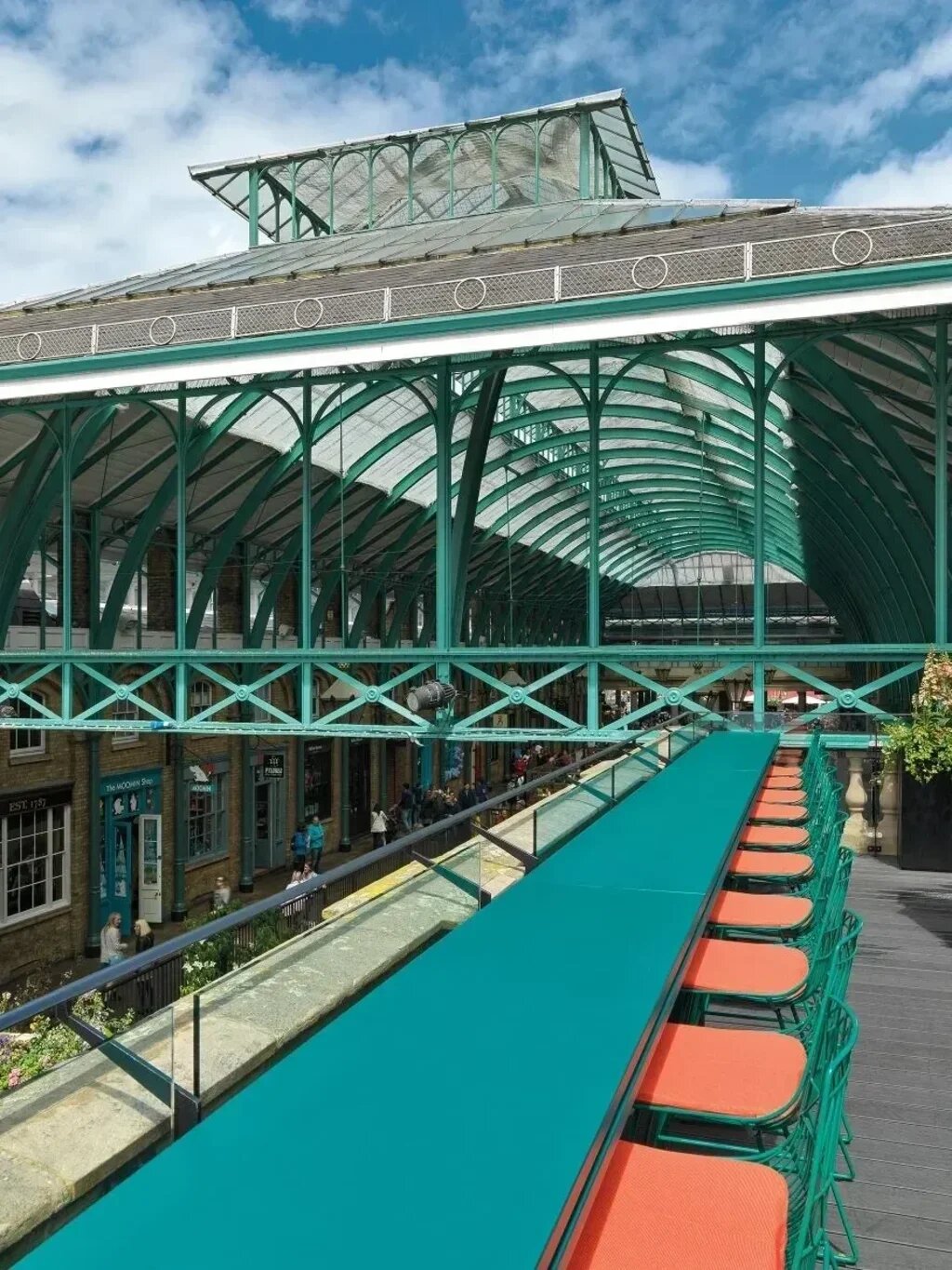 Two terraces, facing North and South respectively offer an unusual open-air experience in London. The first, more intimate, is equipped with sofas, coloured metal tables and large flower-filled vases; the other, which is larger in size, features a long counter and emerald green metal stools, and is visually projected towards the iconic Covent Garden dome and the vivid life of the square. Finally, the external dehor, rebaptized “VyTA Garden” accommodates up to 100 people. Set with tables and chairs and shielded by large white umbrellas, it represents an urban oasis where consumers can take a break from the heat and pace of the city.