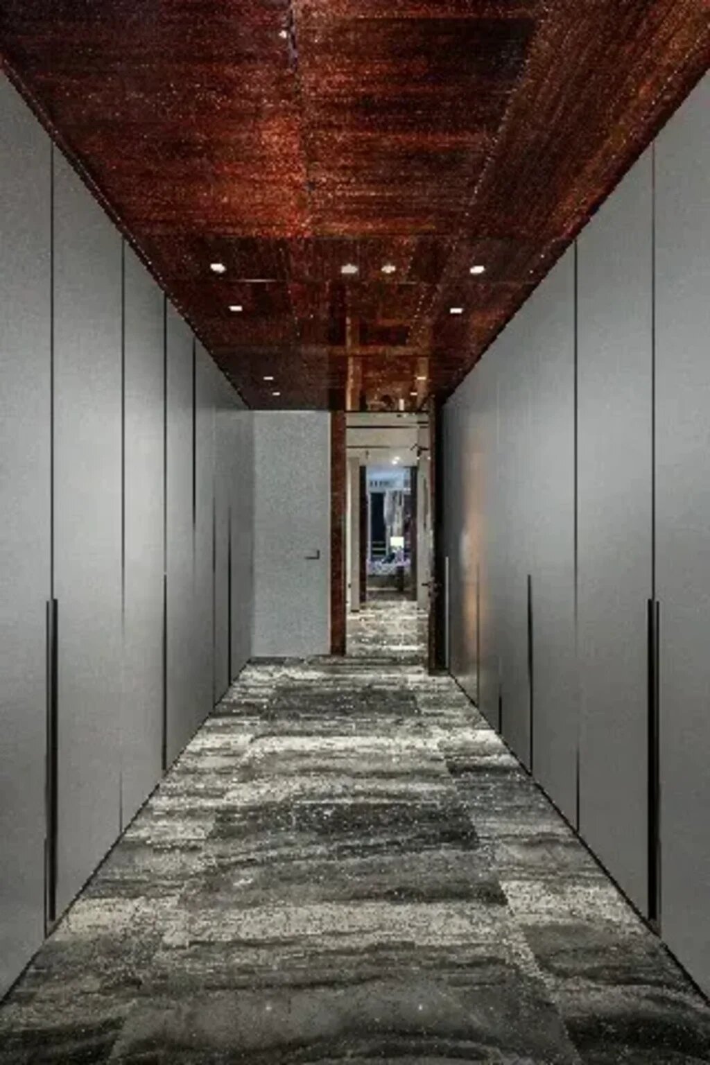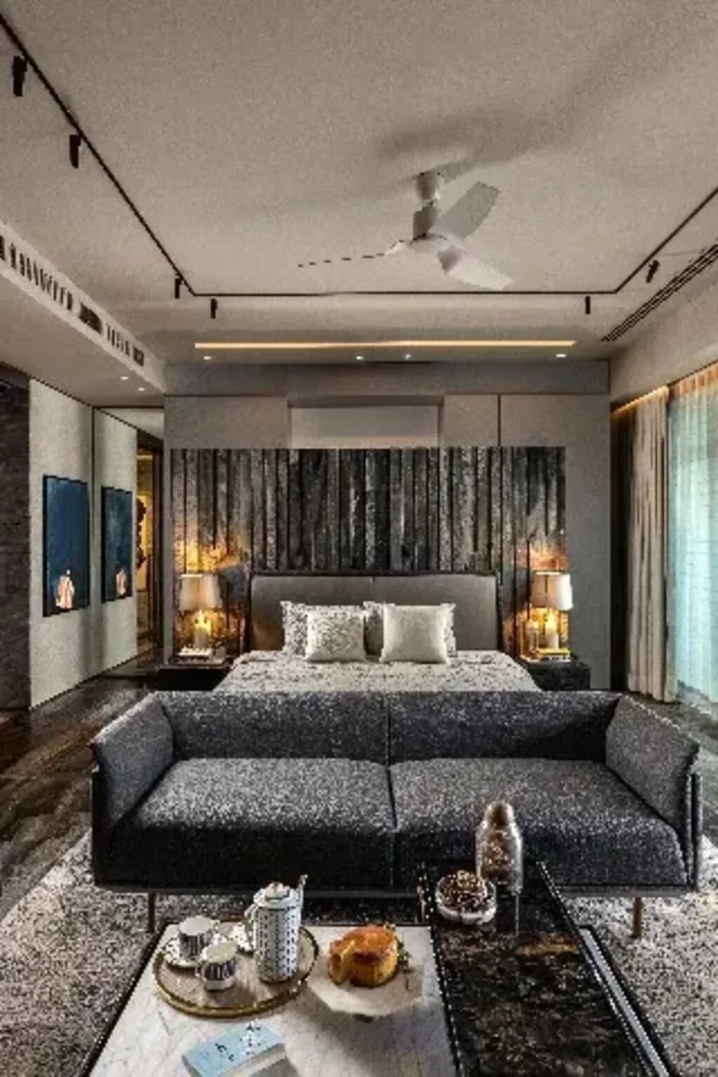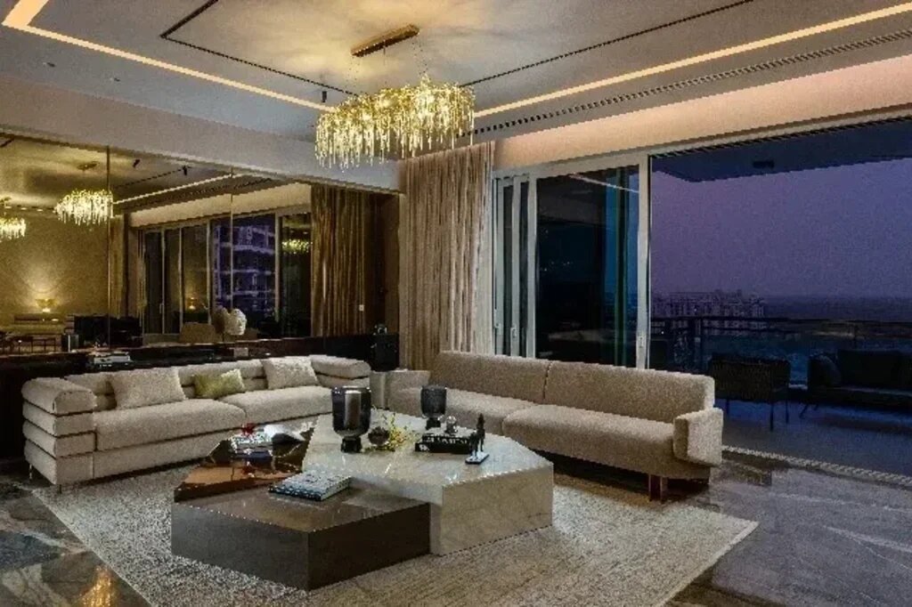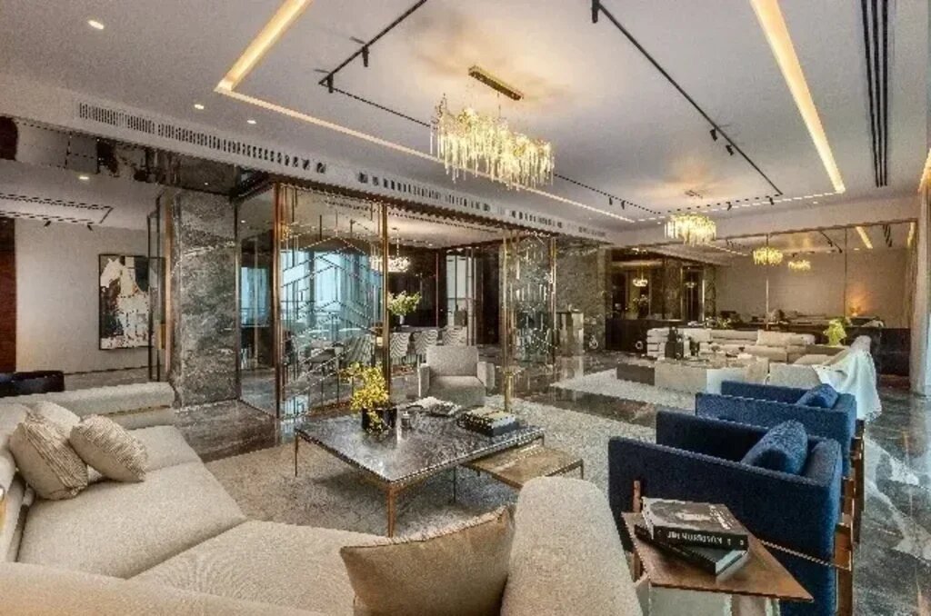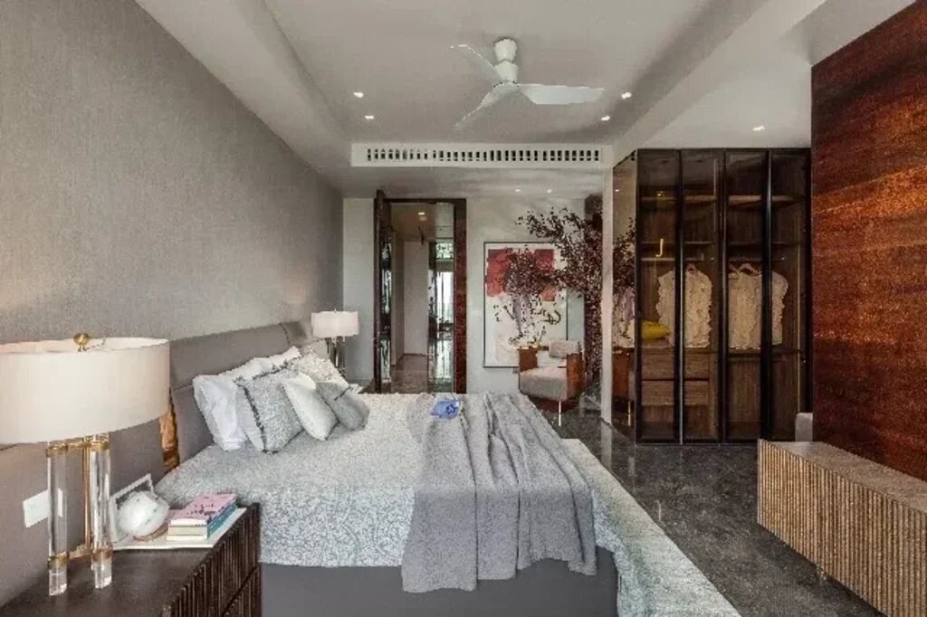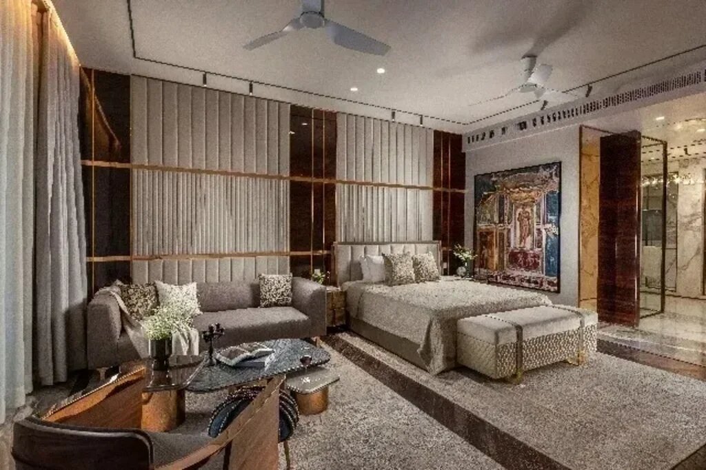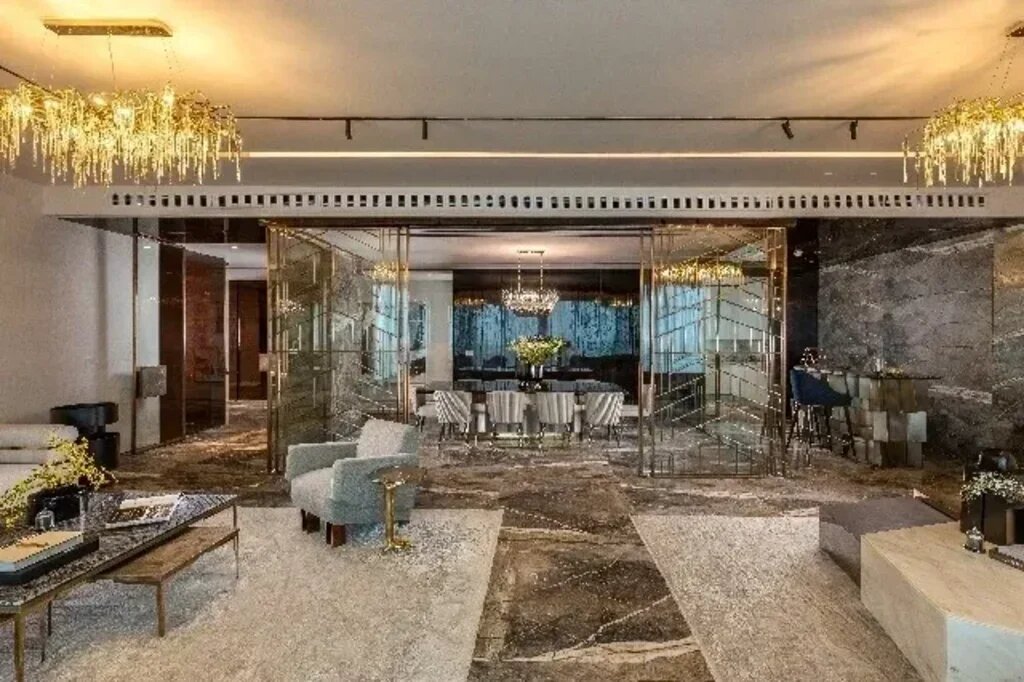 According to Hardesh Chawla, the Principal of Essentia Environments, the client initially desired a 4BHK home like other apartments in Camellias. However, after several discussions, they decided on a three-bedroom layout that maximized the space for hosting and entertaining guests. The grandeur of the house is expressed through majestic chandeliers, marble flooring, and dramatic lighting, but it is balanced by intriguing and surprising elements throughout the space.