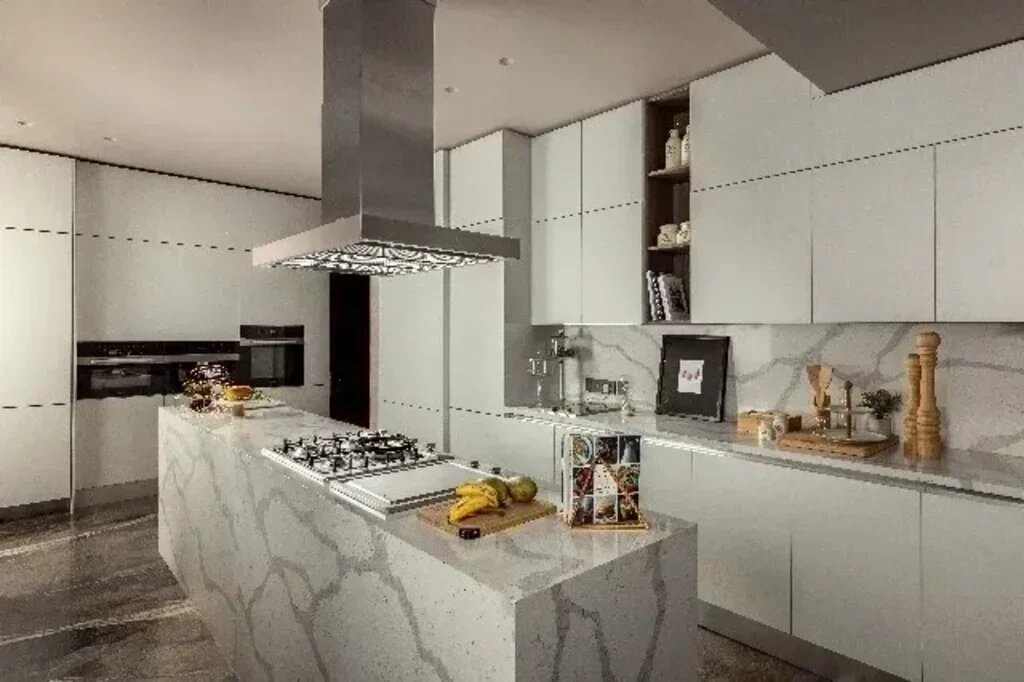 “We dislike corridors as they take up valuable space. Therefore, in this home, the spaces flow seamlessly into one another,” explains Hardesh. This free-flowing layout continues into the kitchen, which, although typically an unused zone in a bachelorette pad, receives a subtle yet sophisticated makeover with an Italian countertop and built-in cabinets. The kitchen is tactfully planned with an entry from the foyer, avoiding disturbances during parties and events.