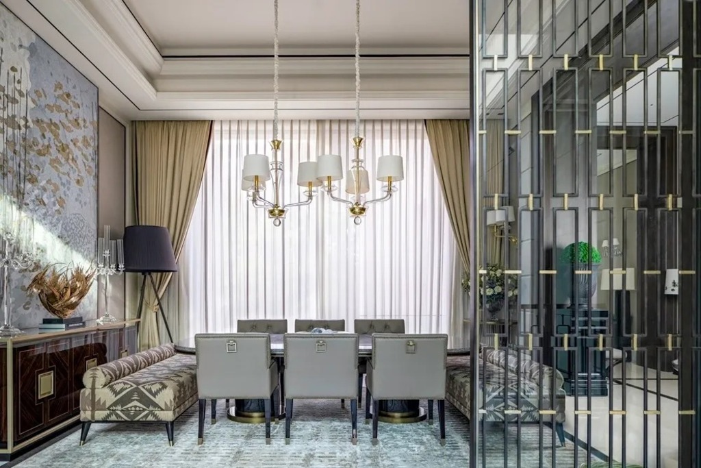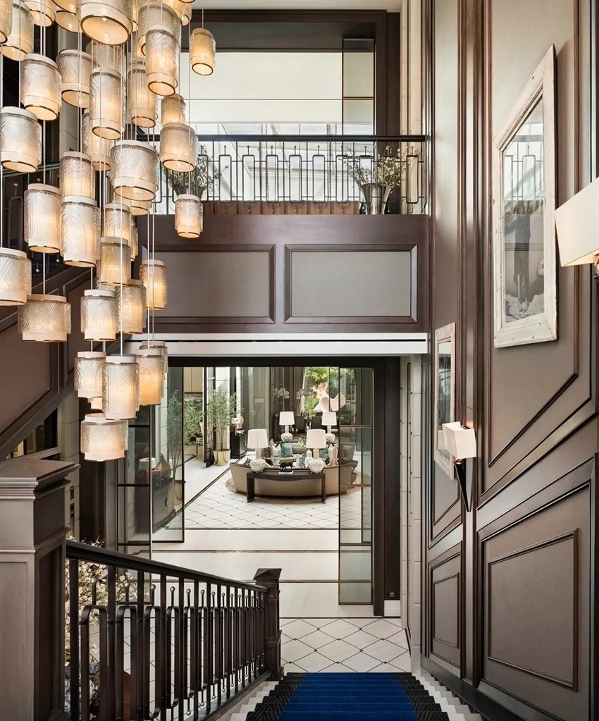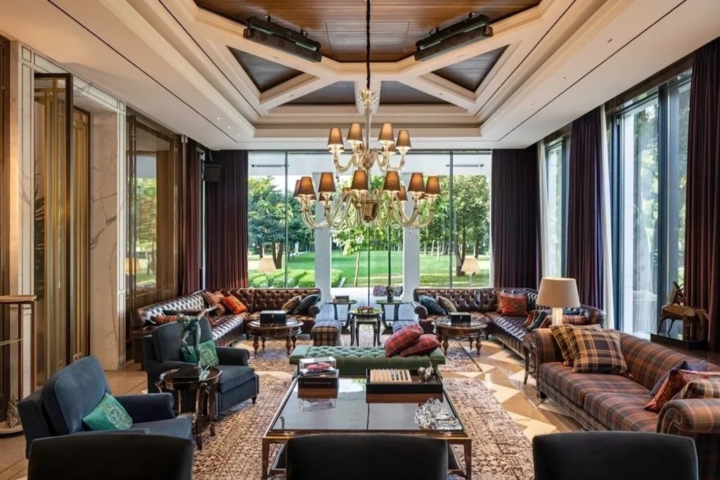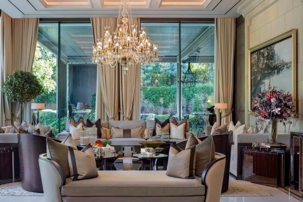 Inside, the Garden Estate offers a meticulously curated blend of classical elements with modern comfort. The interiors reflect the client’s distinct personality and affection for timeless material palettes, creating spaces that feel both sophisticated and inviting. Custom-made furniture and bespoke pieces complement the architecture, enhancing the sense of luxury and refinement. A double – height living space with a skylight serves as the heart of the home, where natural light fills the space and creates a peaceful atmosphere. The carefully chosen color palette, with its neutral tones, resonates with the surrounding greenery, fostering a sense of tranquility and sophistication.