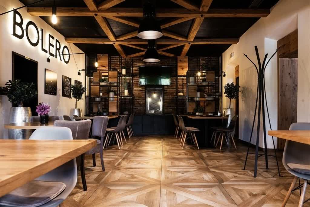 Vintage materials and intense shades for a pleasantly comfortable environment with a strong contemporary mood characterize the Bolero Restaurant based in Naklo, the largest town in Slovenia.
