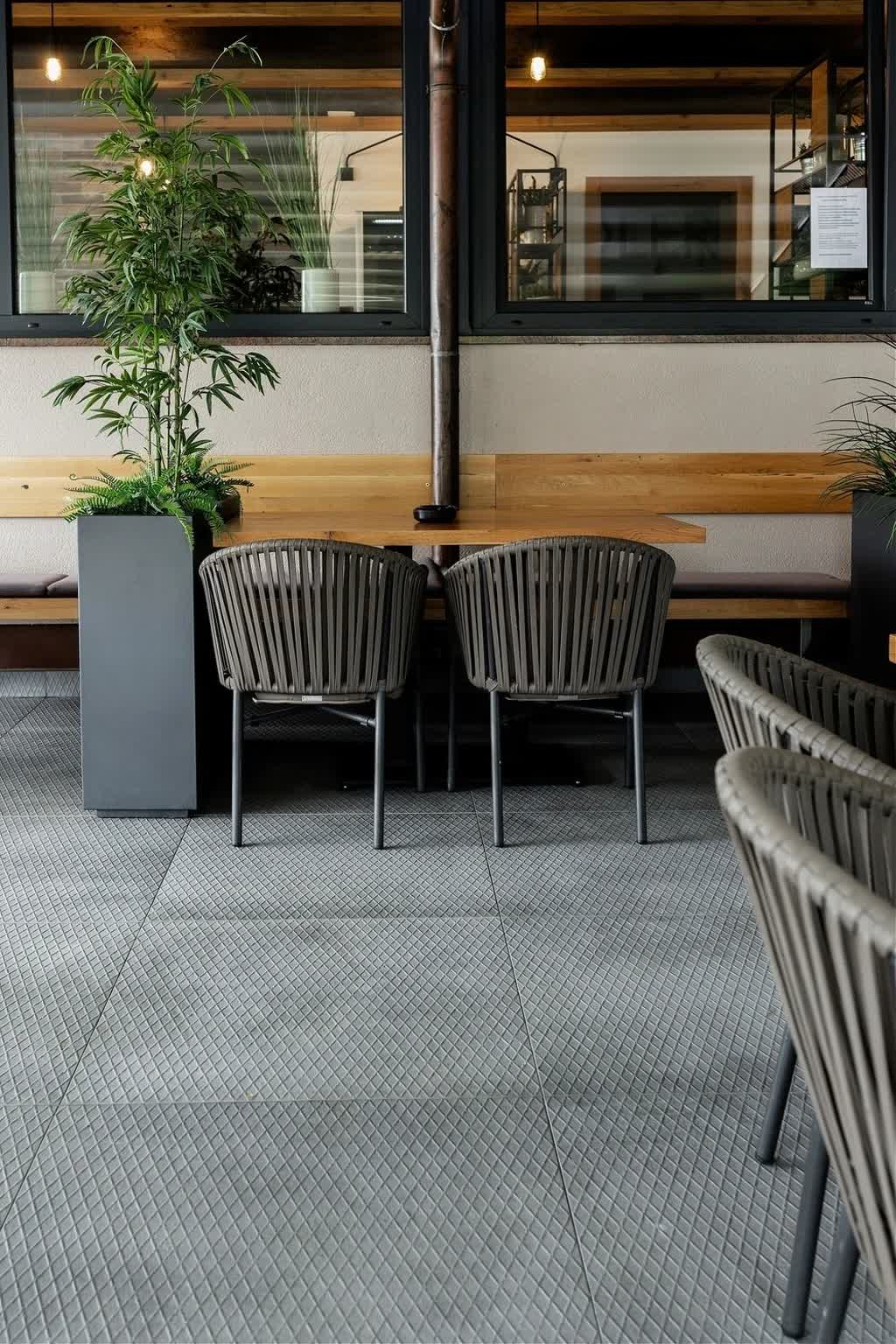 For the outdoor decor, Design Industry was chosen in the Oxide Light Strutturato version, in which the glossy appearance of oxidized metals is emphasized by the three-dimensional texture, reinforcing the contemporary vocation of the project. The result is an urban atmosphere warmed up by the careful selection of furnishings and the skilful positioning of the lights, which offer corners of warm privacy to savour the moment of the meal.