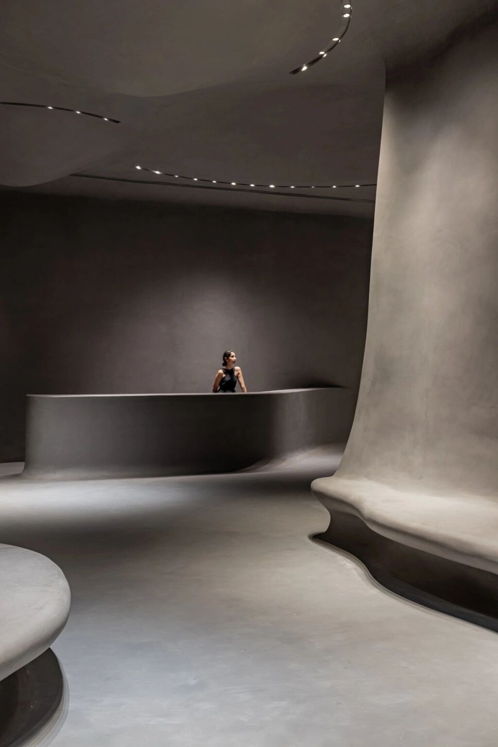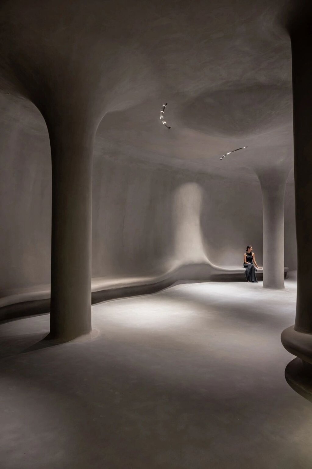 Upon entering, visitors are greeted by a large, fluidly designed foyer that acts as a peaceful transition zone. The space is purposefully calming, with every surface – from the walls and ceiling to the structural columns, seating benches, and reception desk – encased in a homogeneous layer of foam concrete. This minimalist approach, encapsulating the entire volume in a soft, concrete grey, quiets the mind and prepares visitors for the introspective journey ahead. The foam concrete not only offers an ethereal texture but also absorbs sound, reinforcing the tranquil atmosphere of the entrance.