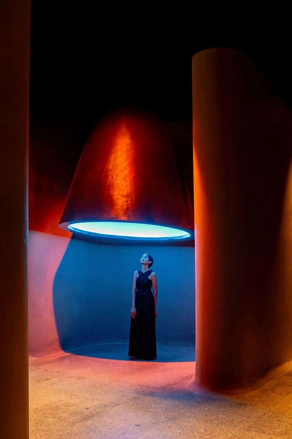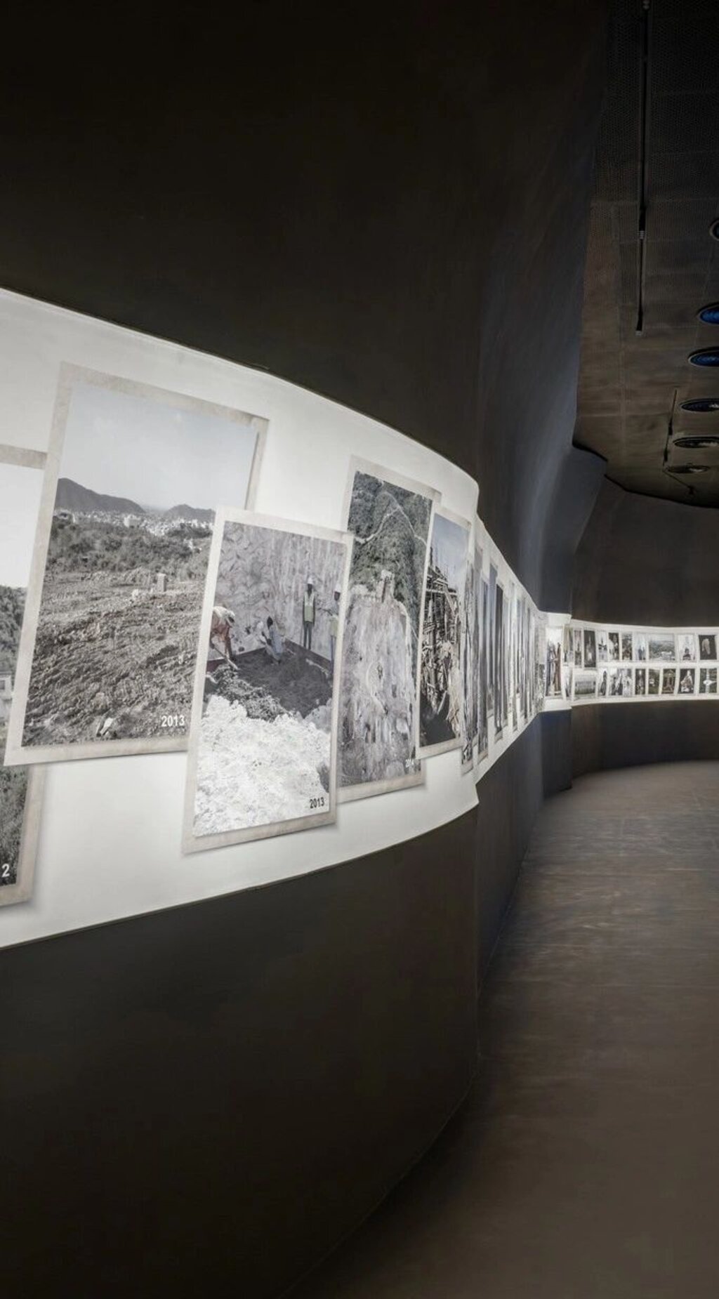 This foyer is more than a mere entrance; it is a sanctuary of calm, a sculptural volume that envelops the visitor and subtly hints at the museum’s larger purpose. The choice of concrete grey, an intentionally neutral and earthy tone, serves to soothe the senses and bring visitors into a meditative state, where they can begin to engage with the core themes of the museum. From this cavernous entry, visitors are led into a narrow, undulating corridor that features images and narratives about the making of the museum. This transitional space is an ode to the creative process behind the museum’s design and serves as a visual guide, preparing the audience for the immersive journey ahead.