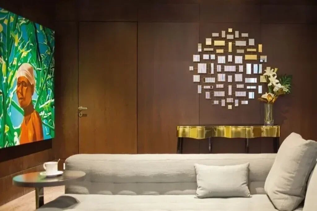 Monolithic wooden flooring spans extensively across most rooms for visual and material congruity, tying together various spatial characters. All floor furnishings, including carpets, have been customized specifically for the house. The lighting scheme, too, is bespoke and customizable, featuring floating ceilings fitted with automated mood lights for controllable environments. Lighting fixtures positioned to be accent-oriented rather than ambient create intentional pockets of bright spots – perfect for highlighting artwork and bespoke, premium luxury furniture elements. Meticulous, understated detailing of the most miniature fittings – such as the door handles, customized in metal and polished to a champagne/brass sheen — adds a unique cachet to the attentive designing at play throughout the residence.
