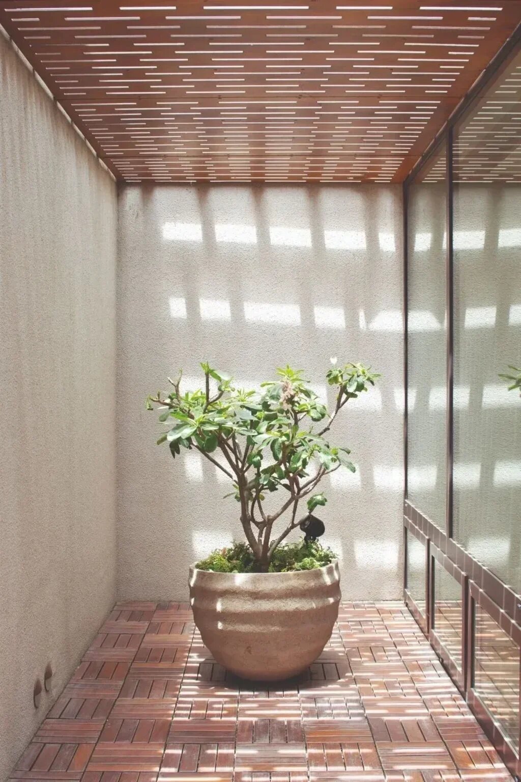 Fabricated using laminated wooden panels with rhythmic perforations, the trellis emerges as a unifying element for the residence, essential in defining its architectural character. It takes the form of a horizontal skylight along the path of the staircase and spreads to encompass the terrace, transforming vertically as a screen to afford a degree of privacy to the second-floor bedroom. An inseparable component of the built mass, the rhythmic pattern creates dramatic plays of light and shadow through the day.