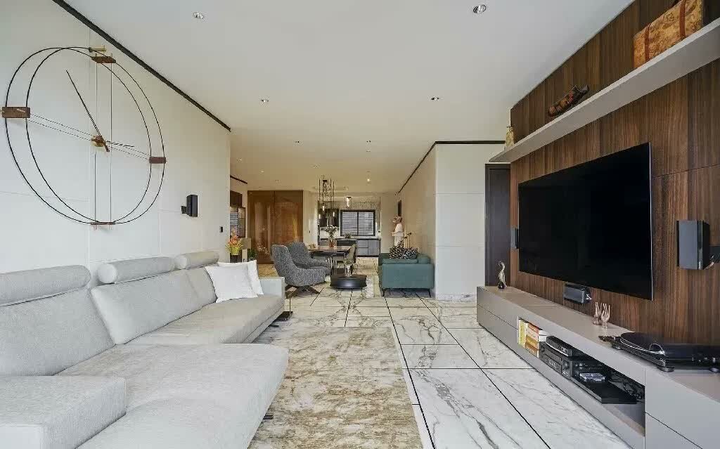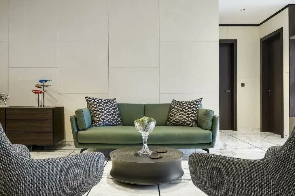 The condominium’s kitchen emphasises the functionality facet. Laminam stone and metallic lacquer frames in triangular-edge profiles render the space in a modern light. The monochrome and geometric flooring carry through into the shared spaces — a canvas of statuario marble that engages geometric play via black inlay work to form rectilinear sections.