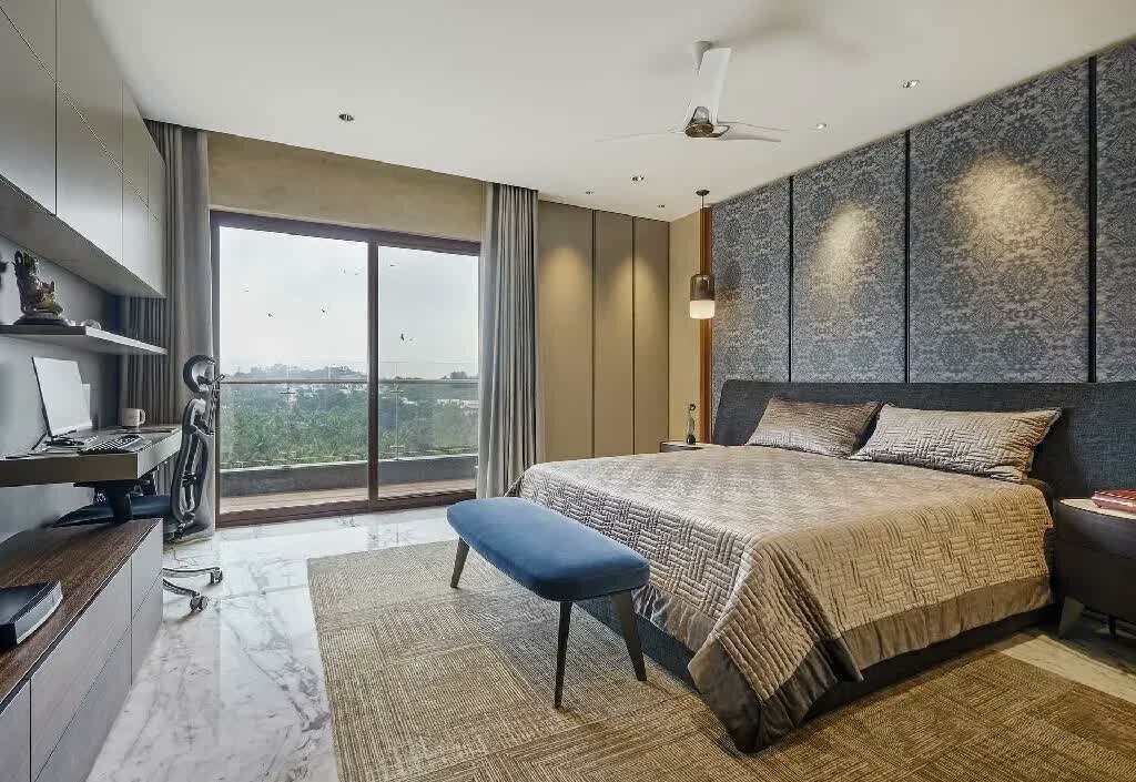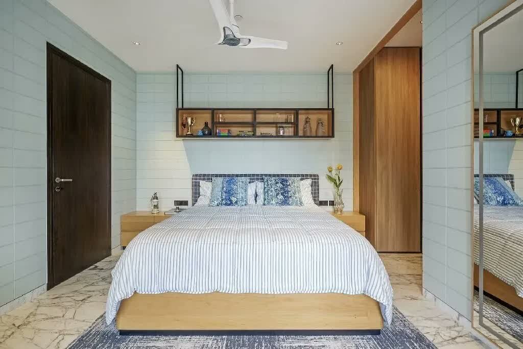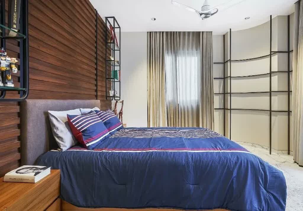 The first bedroom which belongs to the eldest son celebrates warmer umber wood tones in the form of a grooved accent wall with a soft grey upholstered headboard. The array of sleek metal shelving suspended across the room’s walls are meant to host the end user’s curios and memorabilia. The flannel curtains camouflage with the neutral walls, allowing the space to assume an expansive look and feel. Tones of blue and hints of red make their debut in the form of upholstery and fabric to add a pop of colour to the bedroom. The bathroom of this bedroom witnesses the amalgamation of matte natural grey stone, marble and veneered surfaces that imbue it with a sense of understated luxury.