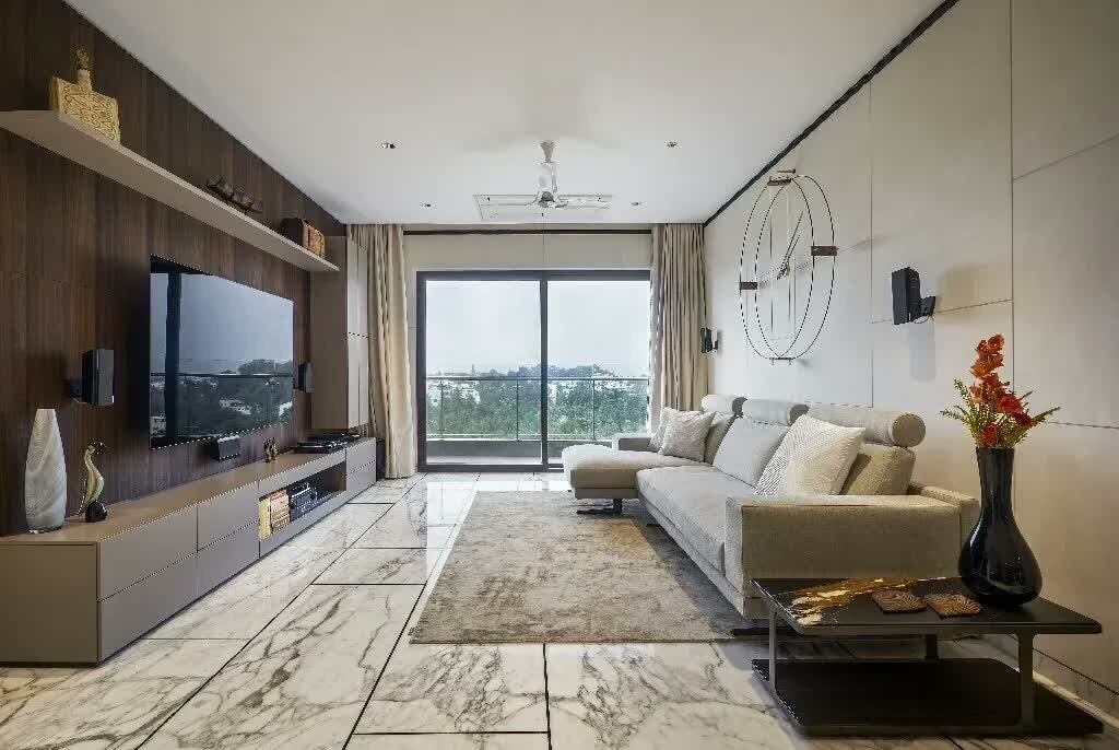 The black shadow line between the walls and the ceiling has been created as a continuous POP band that gives the space an extended sense of visual expanse. The accessories selected have been kept void and light in appearance, not to take away from the minimalism of the walls. The pastel-grey lounge sofa and the TV console unit’s wooden tones headline the visual identity of this nook.