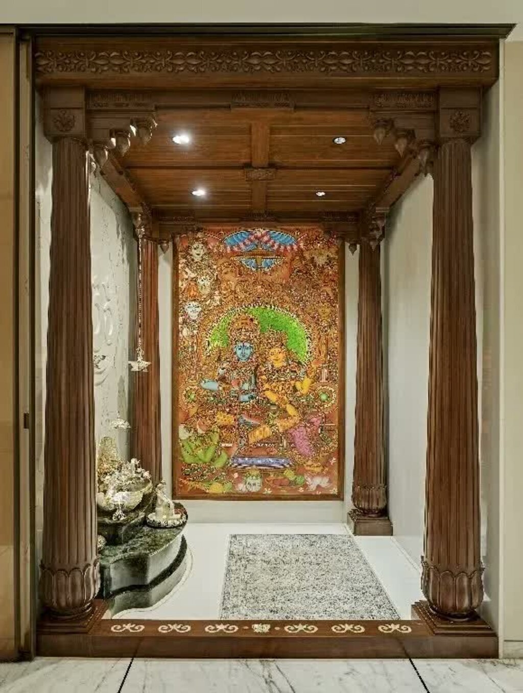 The home opens into a dedicated pooja room that acts as an extension to the living spaces. Inspired by the colossal temples of Hampi, this niche is a simpler take on the elaborate aesthetic of Dravidian temples of the South complete with a commissioned piece of art of the different deities, grounding the space with its artisanal persona.