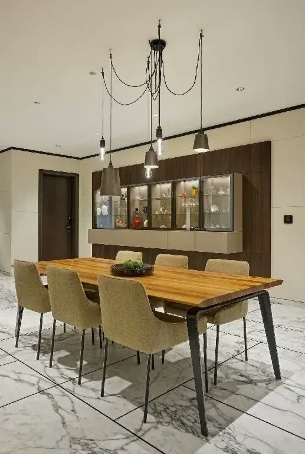 In the dining area, wooden table-top with paper-edges and sleek, angular black metal legs are paired idyllically with contemporary accents of industrial pendants by Buster + Punch. The crockery cum bar unit in the background is a sleek piece of cabinetry that floats weightlessly against the dark veneer panel in the space whilst performing its storage function.