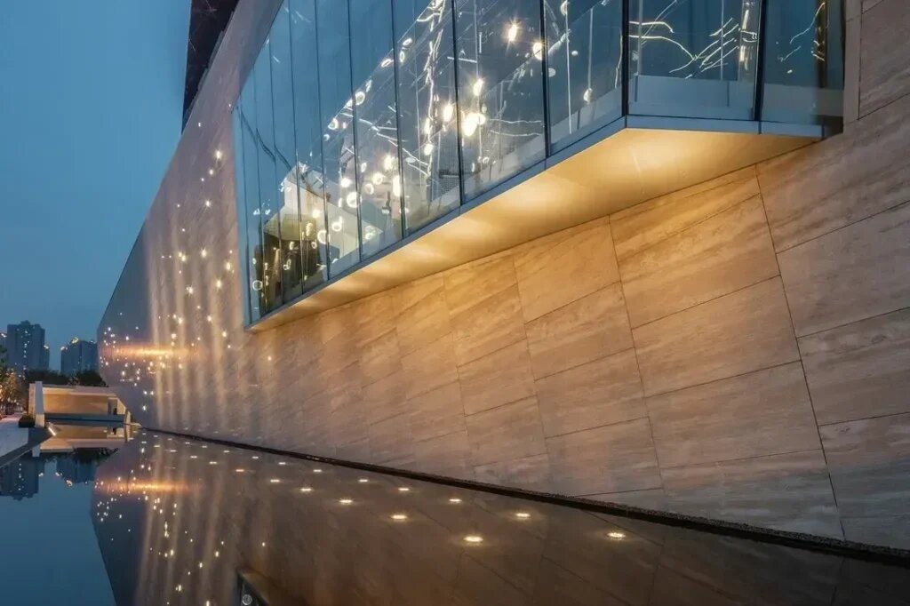 The main entrance is supported by a riveted steel structure to form the principal framework. Large sections of the wall are cantilevered by steel columns, with composite plates inserted to reduce the overall load. This combination contributes to the irregular freehand brushwork facade of the building’s walls. Externally, 800 mm glass cantilevers seamlessly connect the glass framework.