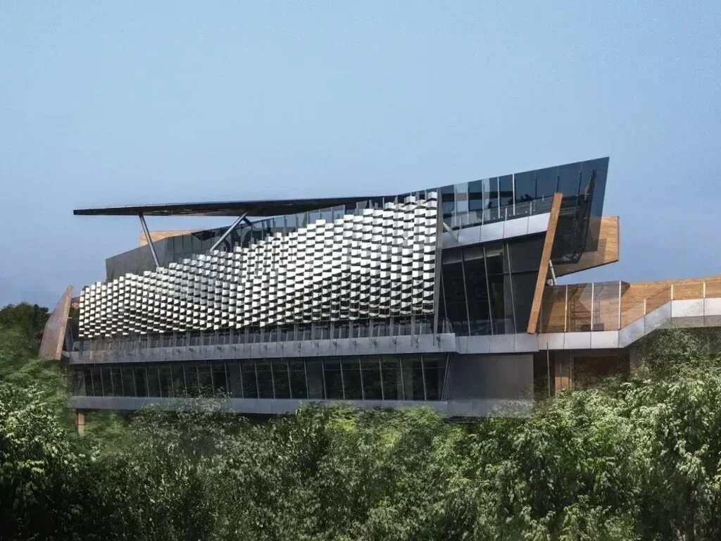 The 3,000m² sales office project consists of four floors. The main entrance is located on the third level, providing access to the main sales center functional areas, including exhibition space, which spans the second and third floors. Embracing the sales center, the ground floor features a heated swimming pool and health club, while a small art gallery occupies the fourth floor.