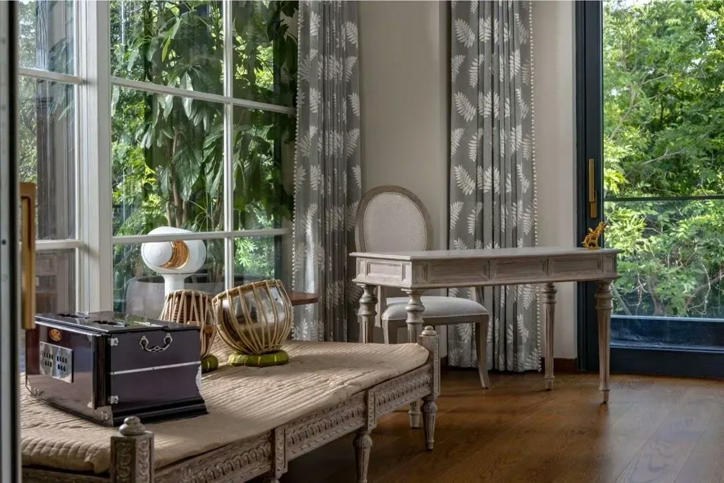 The first floor carries a more eclectic energy. Here, traditional proportions meet contemporary finishes, creating rooms that feel collected rather than curated. Gentle pops of colour infuse personality, while maintaining the understated palette. Bedrooms opening to garden views become serene retreats, where nature remains a constant, calming companion.