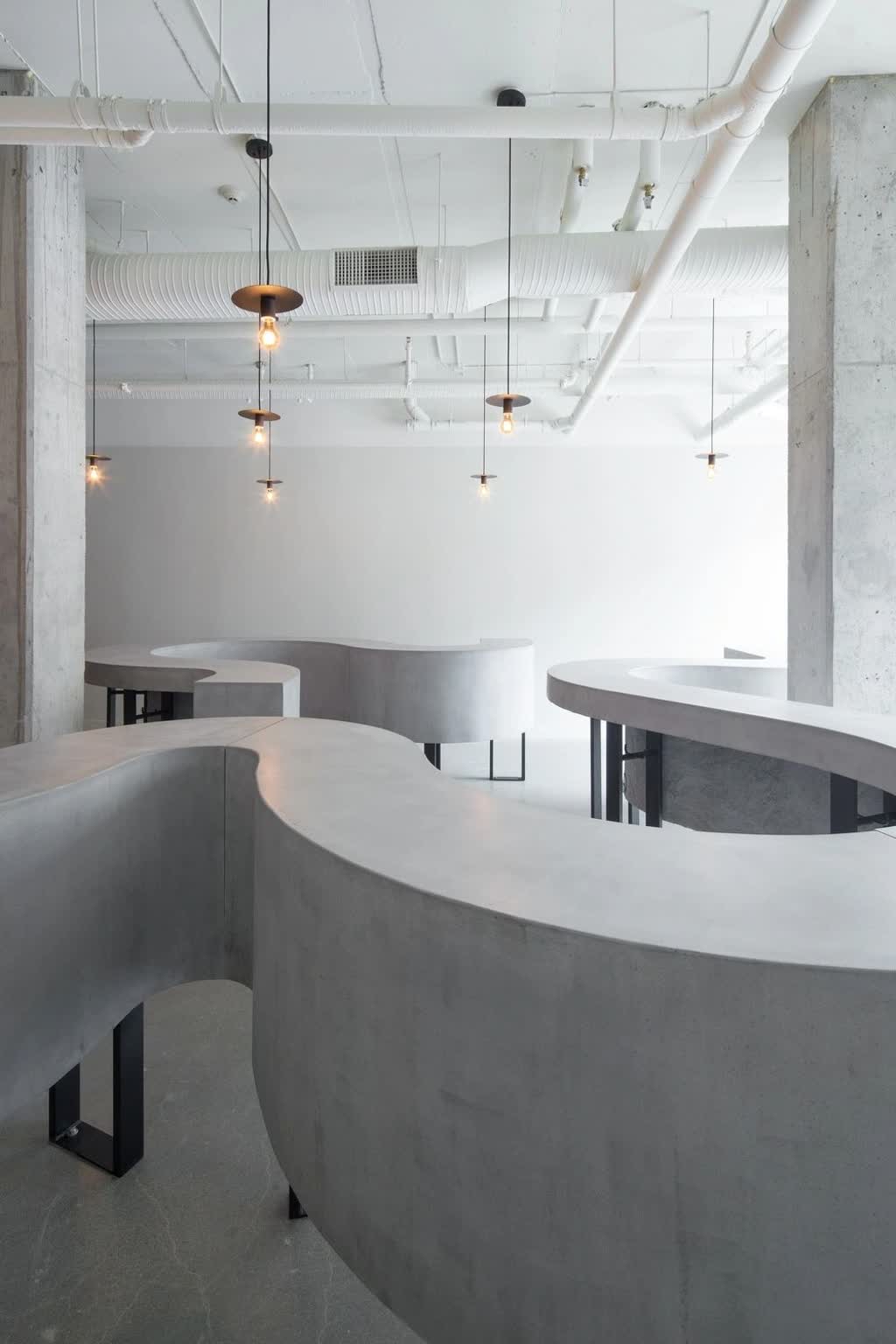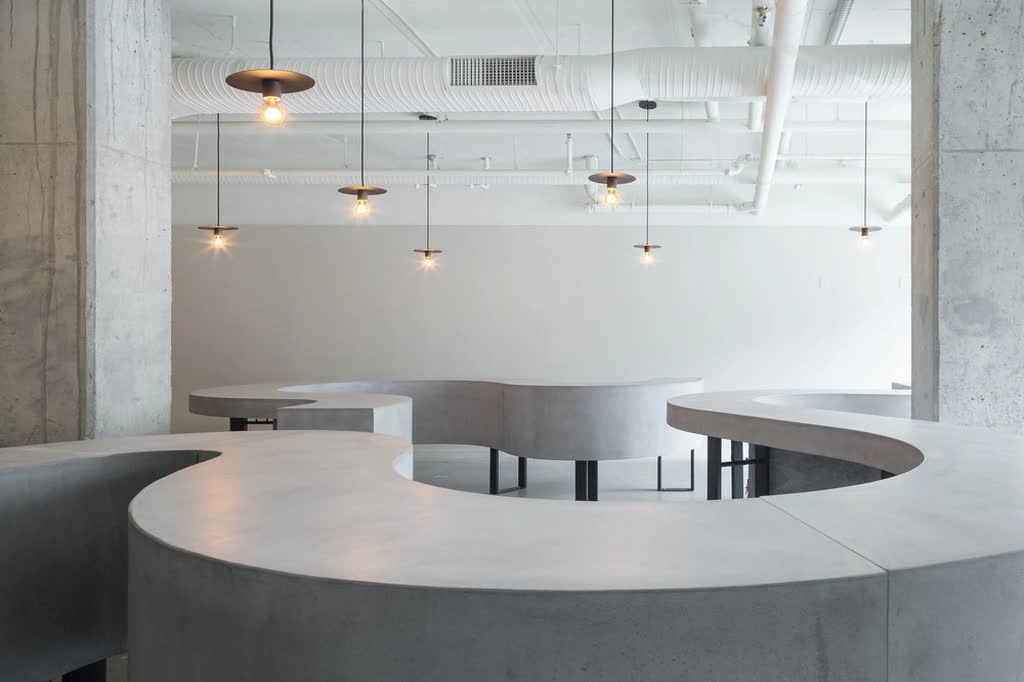 The pared-back simplicity of the interior consists of stripped-back concrete floors, exposed concrete columns, concrete ceiling, mechanical ducts, and conduits. Painted acoustic wall panels combine a uniquely rough-textured appearance with unusual durability and acoustic performance. The simplistic interior yields attention to a single architectural intervention. A 56’-0” long serpentine table floats its way through the space.