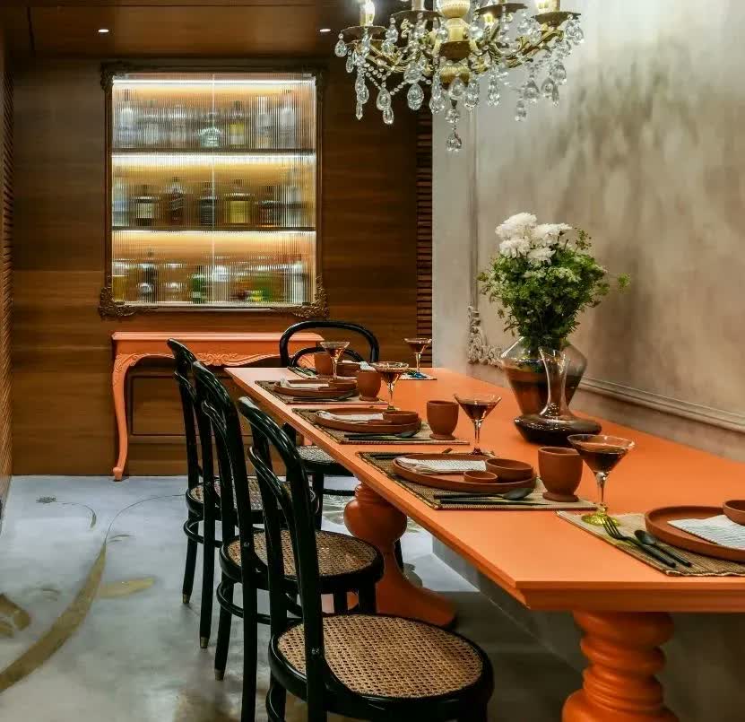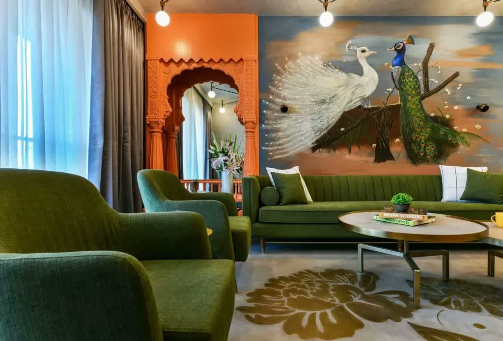 The living room of this three-bedroom apartment basks in the cultural representation of the Maratha and Rajput design styles. The eye-catching orange jharokha, fitted with a mirror, adds depth and character to the space, complemented by the earthy-toned furniture in deep green and browns. Toning down the space is the textured concrete ceiling and floor that allow the exquisite peacock painting on the wall to take centre stage. In contrast, the concrete floor is intricately detailed with liquid metal to shape a striking flooring pattern that adds drama to the overall setting.