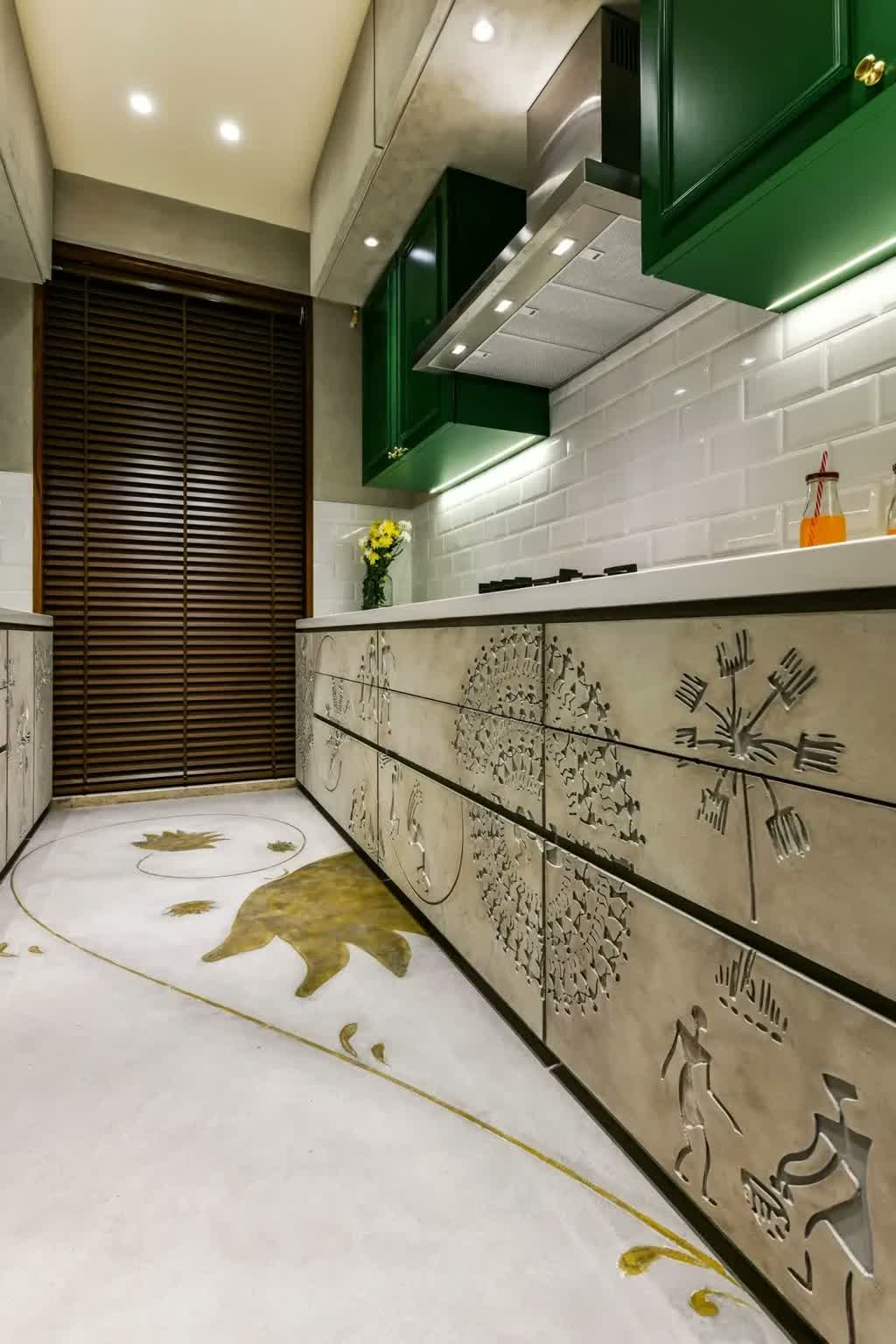 A subtle flow of the cultural language flows into the dining space, which dons an ornate dining table and a delicate console in orange hues. Classic black chairs with rattan bases complete the retro-meet-art deco dining space with a solid textured grey wall, detailed with piping and cornices. The kitchen is a piece of art, a juxtaposing section with classic wooden cabinets shutters, white brick-like dado tiles and Warli art engraved on the shutters below the counter. Portraying Maharashtrian culture art, the shutter is a three-dimensional tectonic sculpture in stone finish milled on a CNC, an exquisite piece of art in itself.