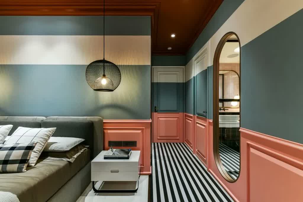 Adapting another contrasting visual language and vocabulary, the master bedroom is an amalgamation of art-deco and bohemian design styles. A playful collaboration of a vivid colour scheme includes shades in poppy pink, egg whites and a delectable blue. The hues are accentuated with cornice details, drop lamps and vein coding panels. Sharply standing out is the circular embedded ceiling in a burnt orange that adds a warm retro feel to the space, while flamboyantly defragmenting the design language.