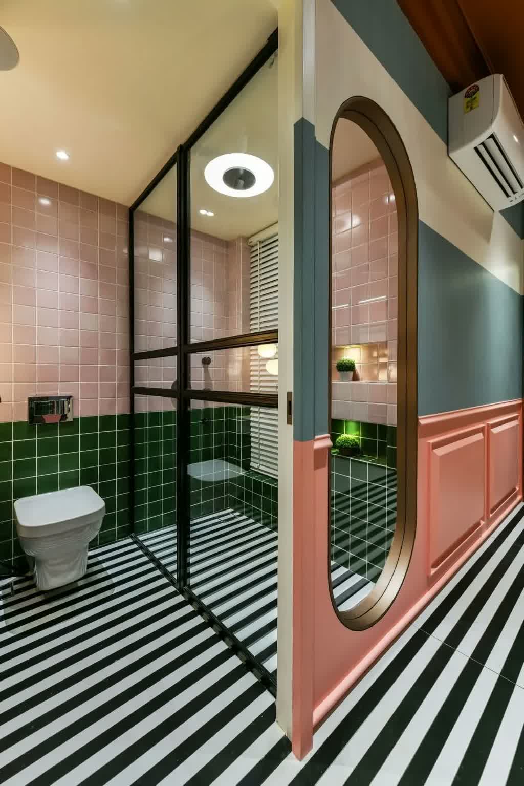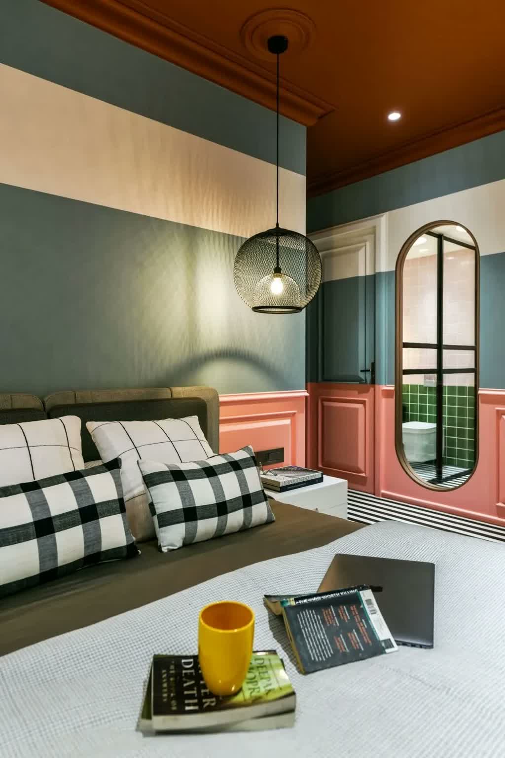 Breaking the solidity of the walls is the distinct capsule-shaped cut-out that offers glimpses of the white and green shower tiles of the bathroom. The room is a loud personification of the inhabitant’s vibrant personality that is hard to miss and can be defined by one singular style.