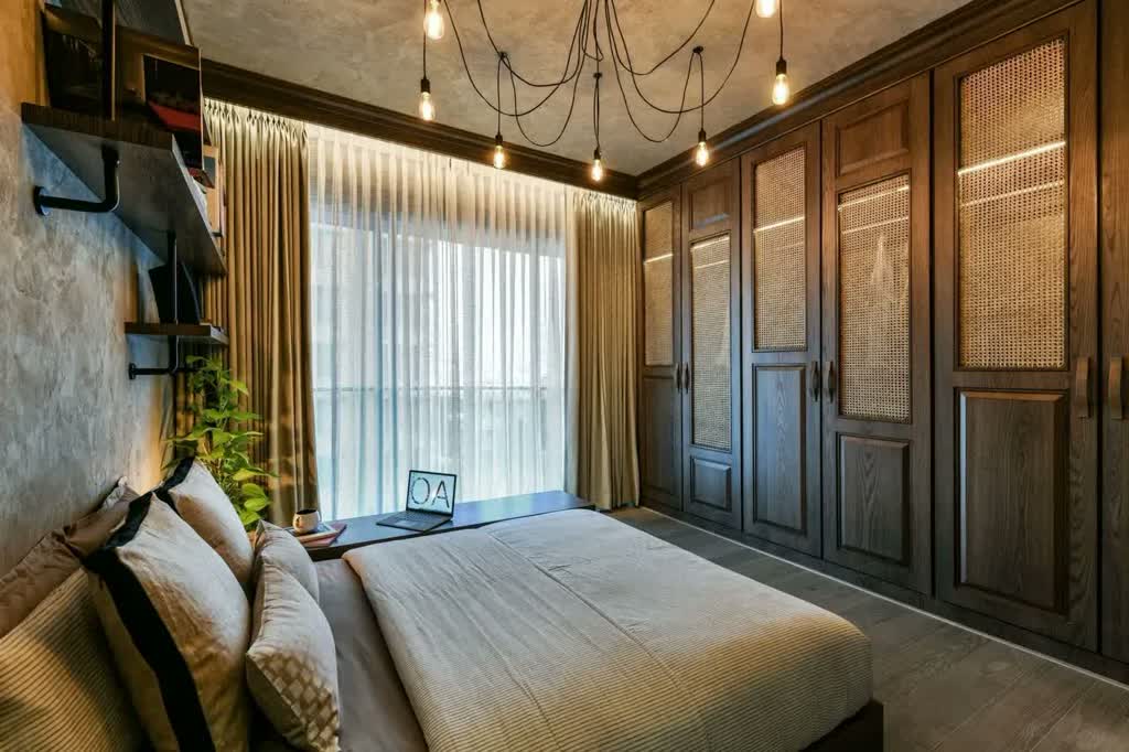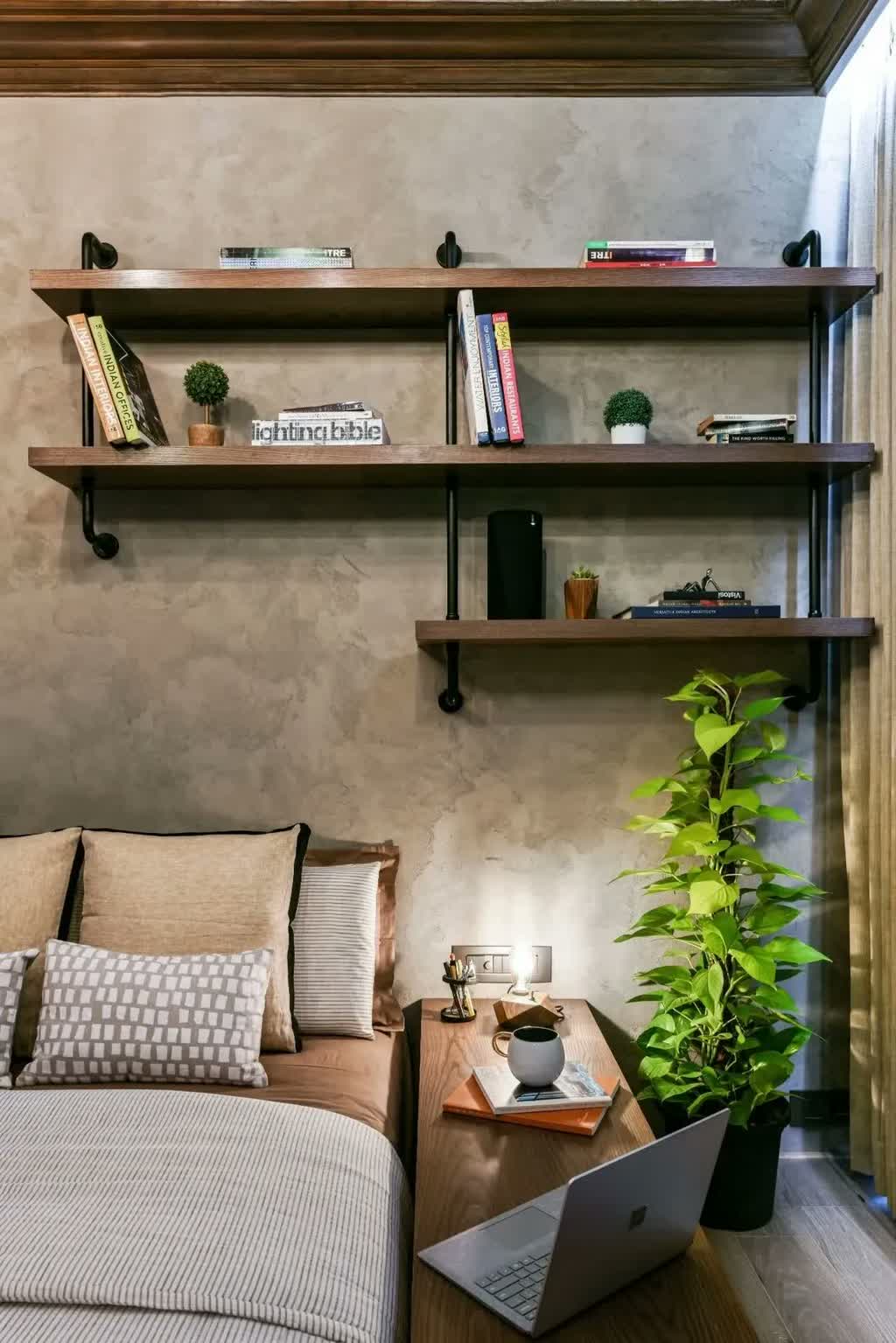 The other room in the house tells another distinct story, one that is contemporary and rooted in the organic style. Belonging to the client’s daughter, the room is made with an exposed ceiling adorned with textured concrete patterns, a detailed cornice running along the edges and a rustic chandelier. One surface of the room is made up of wardrobes that are made with polished timber shutters and rattan screens, imported from the local market in Oshiwara.