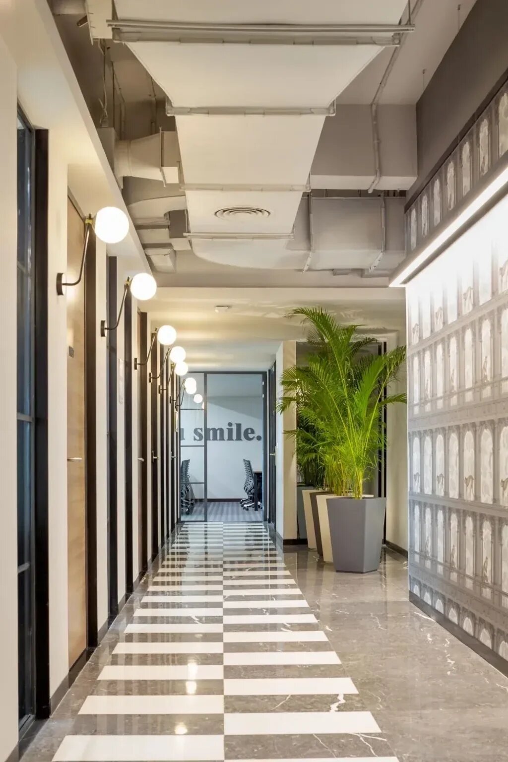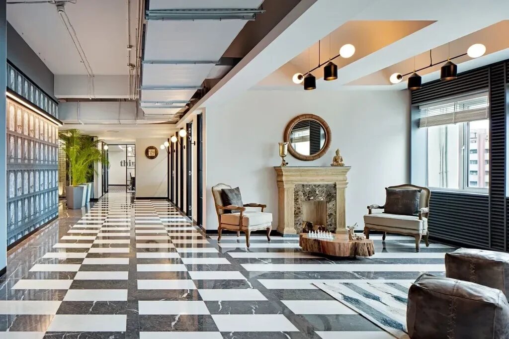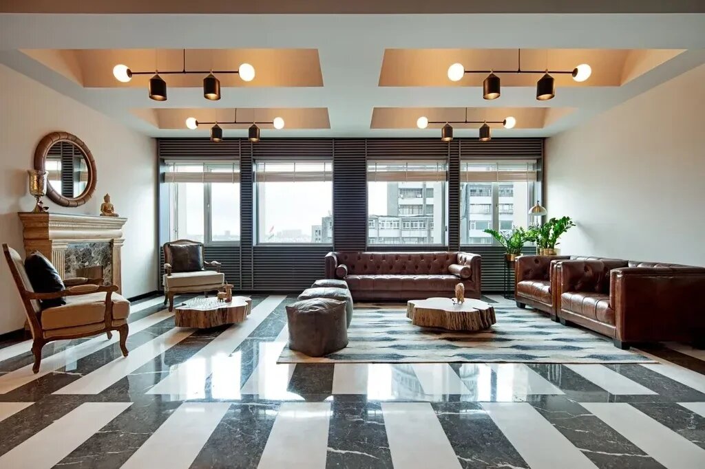 Underfoot, statement chess-board patterns elegantly unfold, evoking nostalgic reminiscence of a bygone classical era. Illuminated by generous natural light, the rooms boast stepped ceilings, gracefully tapering towards the exterior, further amplifying the ingress of daylight. To compensate for the lack of natural greenery, the walls at the room ends embrace a soothing green hue. Windows, metaphorical picture frames, are painted in dark tones, artfully framing captivating vistas.
