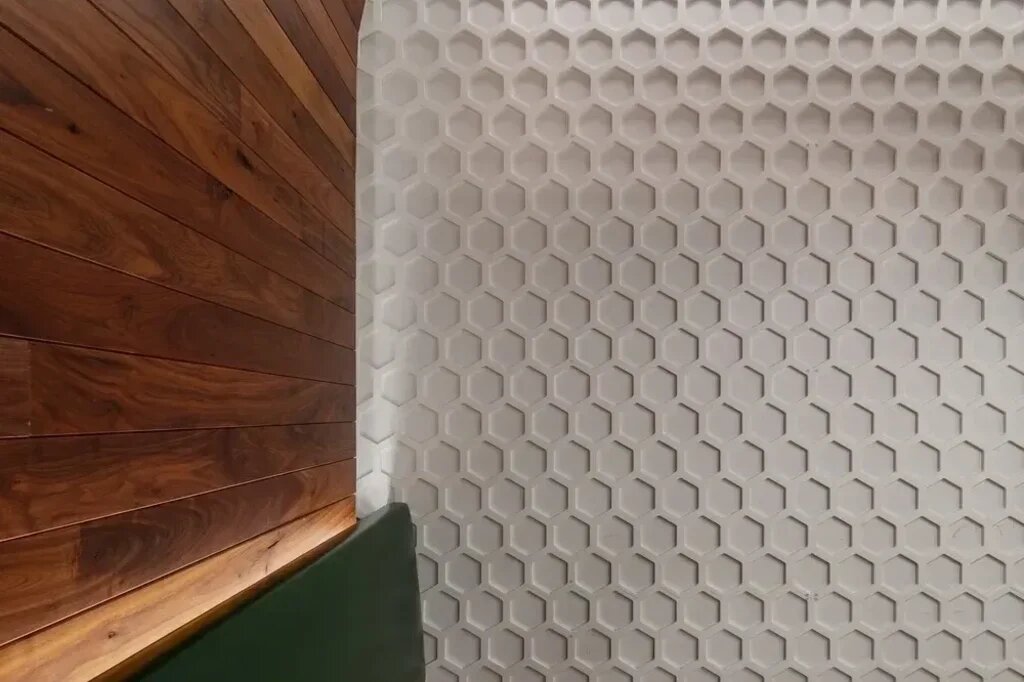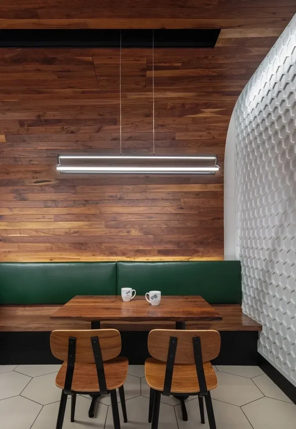 Materials dialog as the honeycomb-patterned floor and textured wall meet walnut, articulated from chairs and bench seating to wall and ceiling.