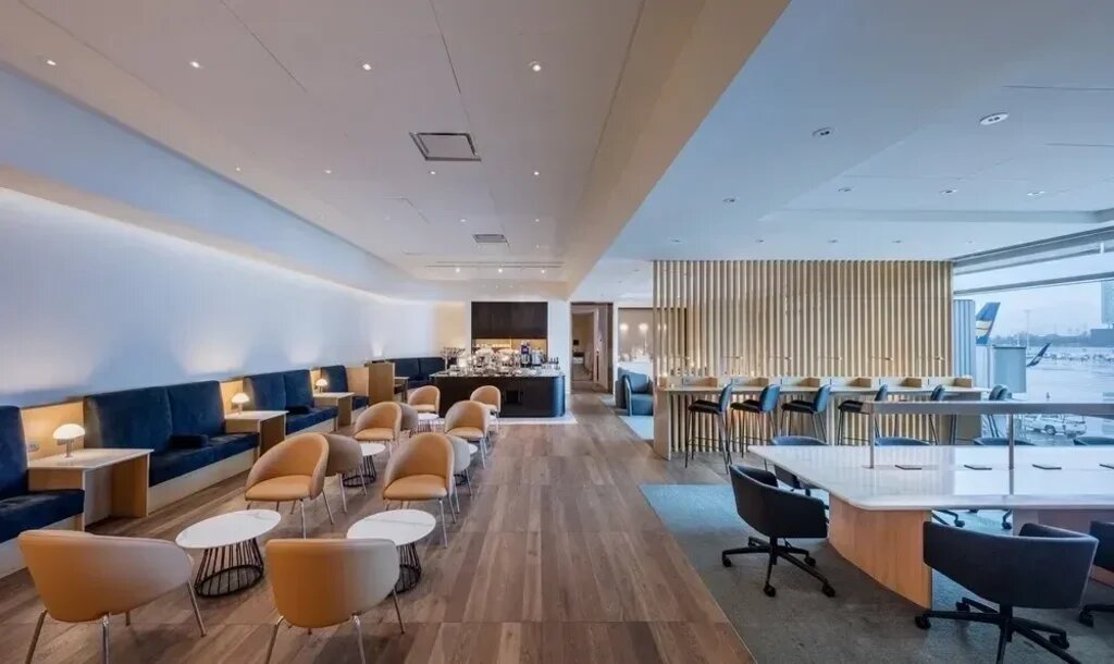 In the reception area of lounge, located in Concourse A between gates A4 and A6 at SFO, the airlines’ logo features on a plush, dark blue wall fronting two metallic check-in podiums.