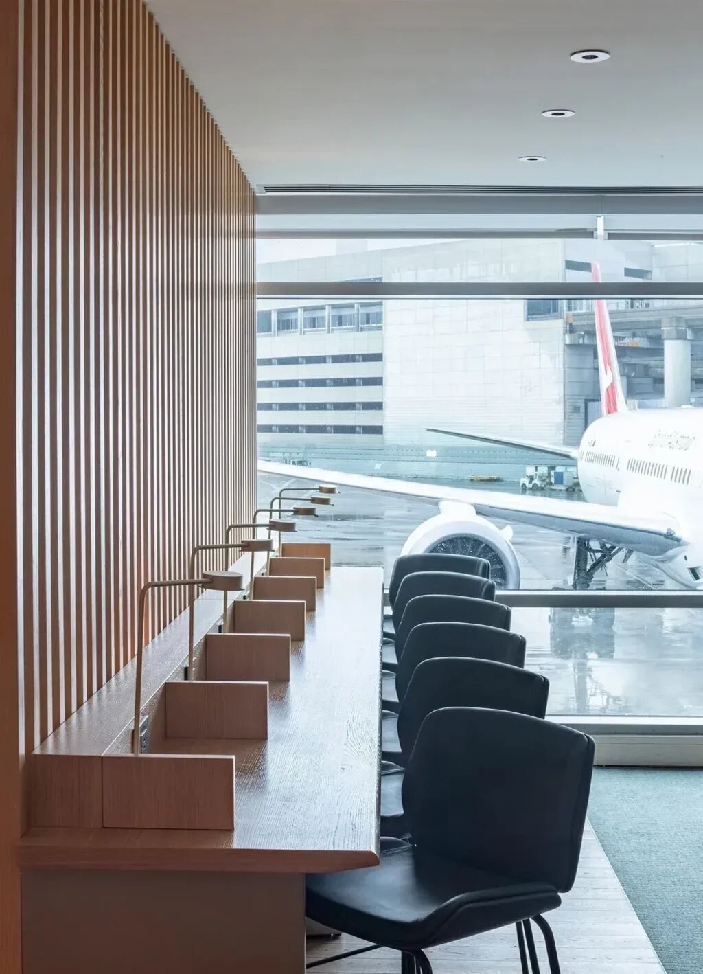 80 percent of seats in the lounge have access to power, including dedicated work areas with runway views.