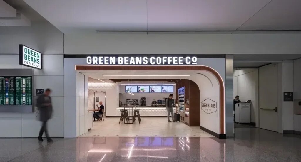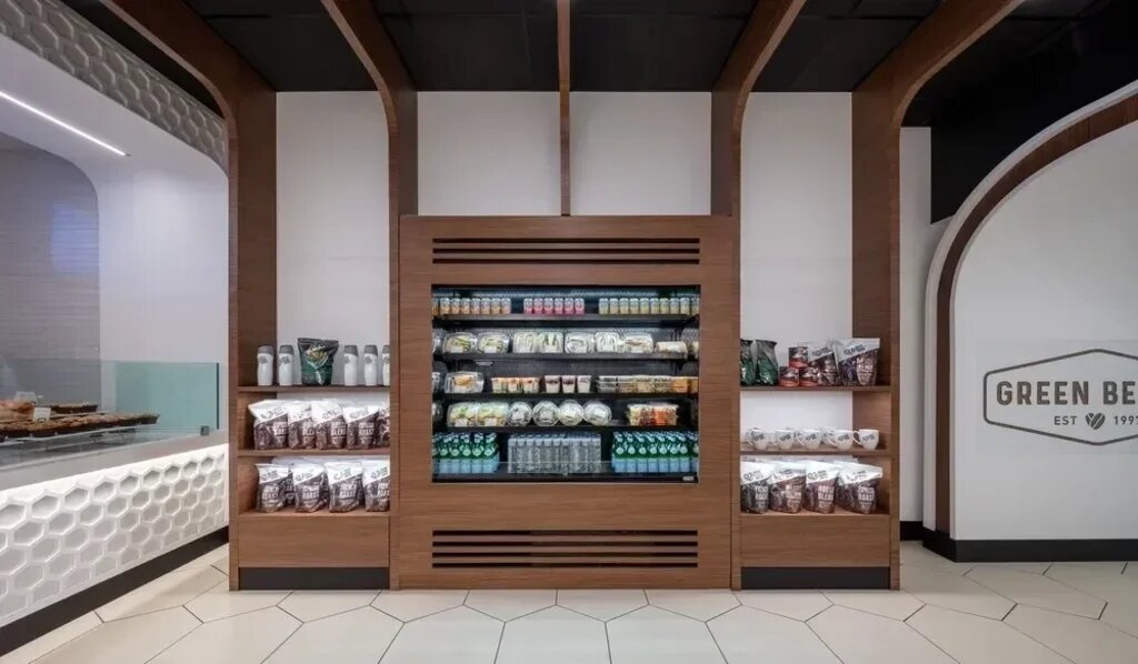 Critical to the design for Green Beans’ new outpost in the International Terminal at SFO was the company’s desire to create “cafes of calm” for busy people. WDA realized a comfortable environment evoked through natural materials, warm lighting and textured finishes. At the entrance, the outline of walnut, which sweepingly curves down from the ceiling to the coffee brand’s logo, initiates a welcoming gesture, while framing a view into the space.