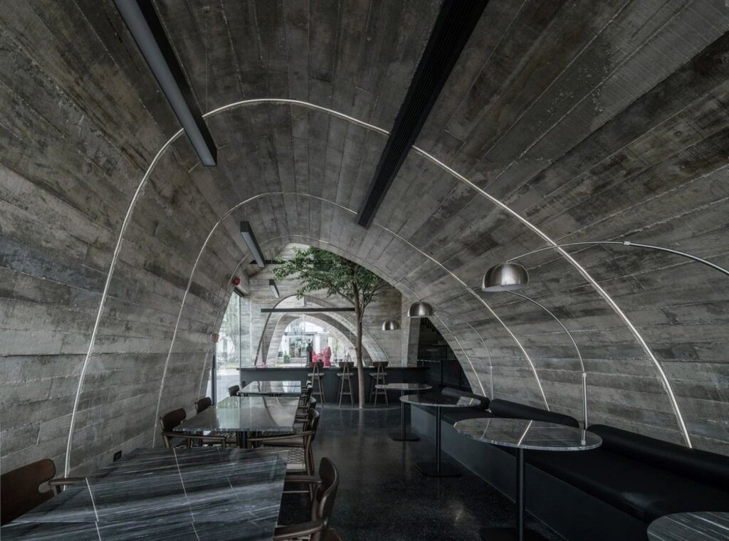 The furniture, selected with the same attention to detail, complements the café’s overall aesthetic. Soft curves echo the imperfect arches, while the use of modern materials keeps the space feeling fresh and contemporary. LED lights further enhance the design by tracing the outlines of the arches, casting a warm glow that highlights their unique shapes. These lights draw attention to the fluidity of the design, guiding the eye along the curves of the space and creating a memorable, immersive experience for visitors.