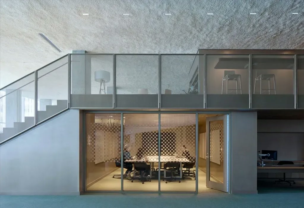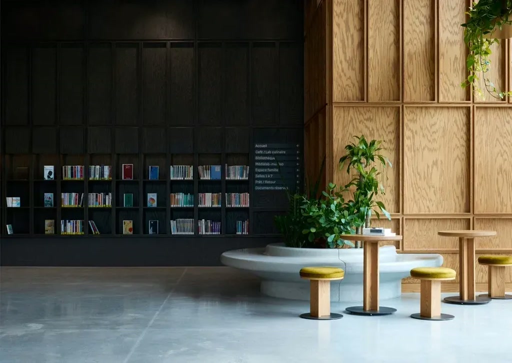 Acoustic control is a critical component of the design, addressed through coffered wood ceilings, suspended fabrics, and exposed sprayed cellulose. These elements enable the large, open volumes to accommodate a wide range of activities — from performances and gatherings to quiet reading — without compromising comfort. Integrated planting introduces moments of softness within the interior, contributing to a sense of well-being and spatial balance.