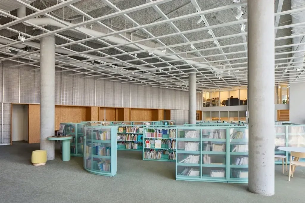 Internally, the spatial organization unfolds as an archipelago of interconnected “islands,” each calibrated for a specific atmosphere and function. The ground floor is anchored by a central agora, around which a café, performance hall, multi-purpose room, and express library are arranged. This animated sequence fosters informal encounters and public engagement. A broad, naturally lit staircase connects to the upper level, where the main library spaces wrap around a central mezzanine. Adult and youth collections, reading and study areas, multi-purpose rooms, and a children’s play zone establish a rhythm between openness and retreat.
