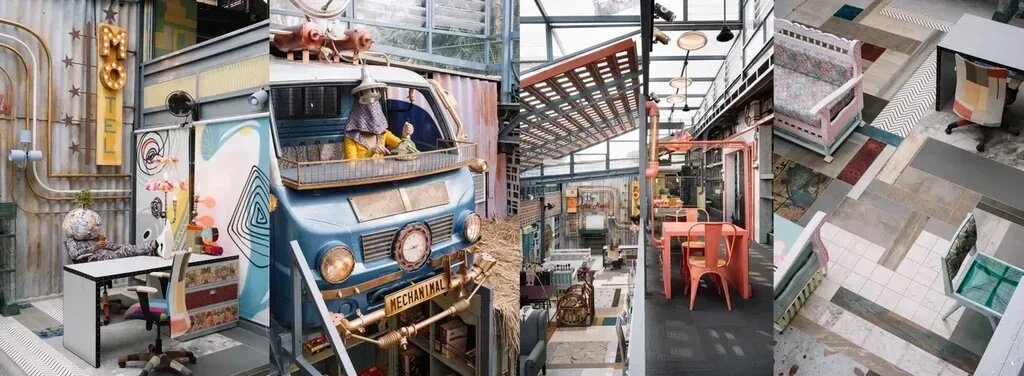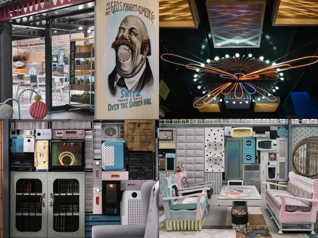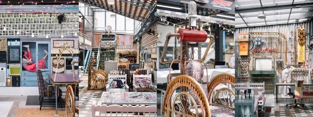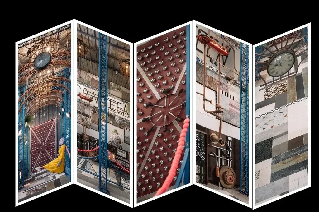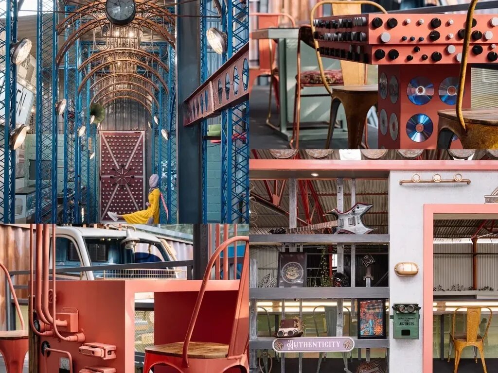The entrance features a series of arches crafted from scrap metal bathed in a lively teal hue. The passageway is adorned with grunge chandeliers made from bike chains and metal filings, flanked by upcycled vehicle headlights serving as luminaires. The overarching flooring is a collage of discarded display samples, meticulously assembled in a Tetris-inspired fashion. A patchwork collage of discarded wallpaper swatches creates a captivating backdrop for the food counter, infusing it with a dynamic interplay of color and pattern. The central collage wall is an eclectic mix of e-waste, sanitary fixtures, and discarded furniture, forming a whimsical mosaic of discarded materials.